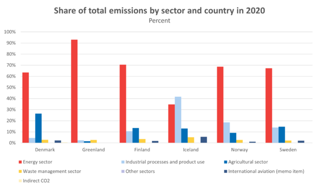 The figure below illustrates differences in sectors responsible for emissions. More detailed information on these differences can be found at the Nordic Energy website [2].