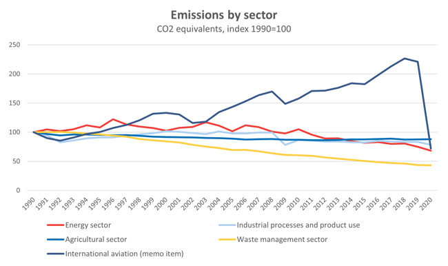 International aviation accounts for a small share of emissions for most countries, one to two percent for Denmark, Finland, Norway and Sweden and six percent in Iceland in 2020. But the part that International aviation plays in the 2020 drop in emissions is large, between 26 percent in Finland and 78 percent in Iceland.