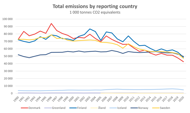 Worth noticing is that total emissions in Denmark, Finland, Norway and Sweden are almost equal today, despite the countries difference in population. This is mainly due to differences in use of fossile fuels and industrial sectors.