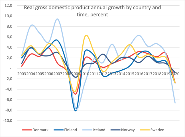 The macroeconomic development in the Nordic countries is one of many things that have been affected by the ongoing pandemic. Like so many others, the Nordic countries have experienced a decline in gross domestic product (GDP) growth. However, when compared with other EU countries, the Nordic countries have done relatively well.