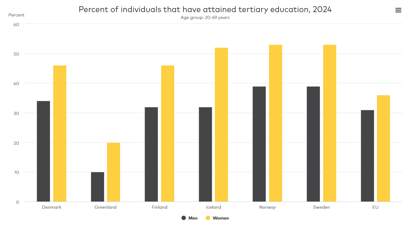 Women are more likely than men to attain tertiary education in all Nordic countries. In 2024, a higher percentage of women had attained tertiary education compared to men in all represented countries. The largest relative difference can be observed in Iceland by 20 percent. This is followed by Finland, Norway and Sweden that all register a difference by 14 percent. This can be compared with a difference of 5 percent between men and women in the EU. However, the tertiary educational attainment is lower in the EU for both men and women compared to most Nordic countries.