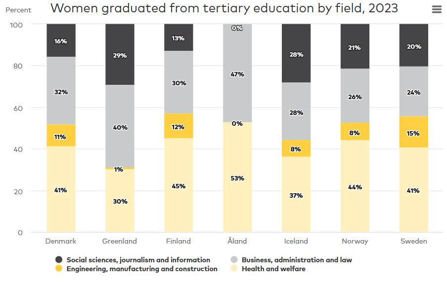 Women are more likely to attain tertiary education than men in all Nordic countries. Despite this educational advantage, men have higher gross hourly earnings than women on average. Differences in educational choices among men and women may serve as partial explanations for these wage differences. However, the wage gap is persistent within a broad range of economic sectors. Other potential confounding variables, such as specific job roles and years of experience are also likely to play a role. Nonetheless, the data establishes an overall trend where wage differences are favouring men across the Nordic labour market.