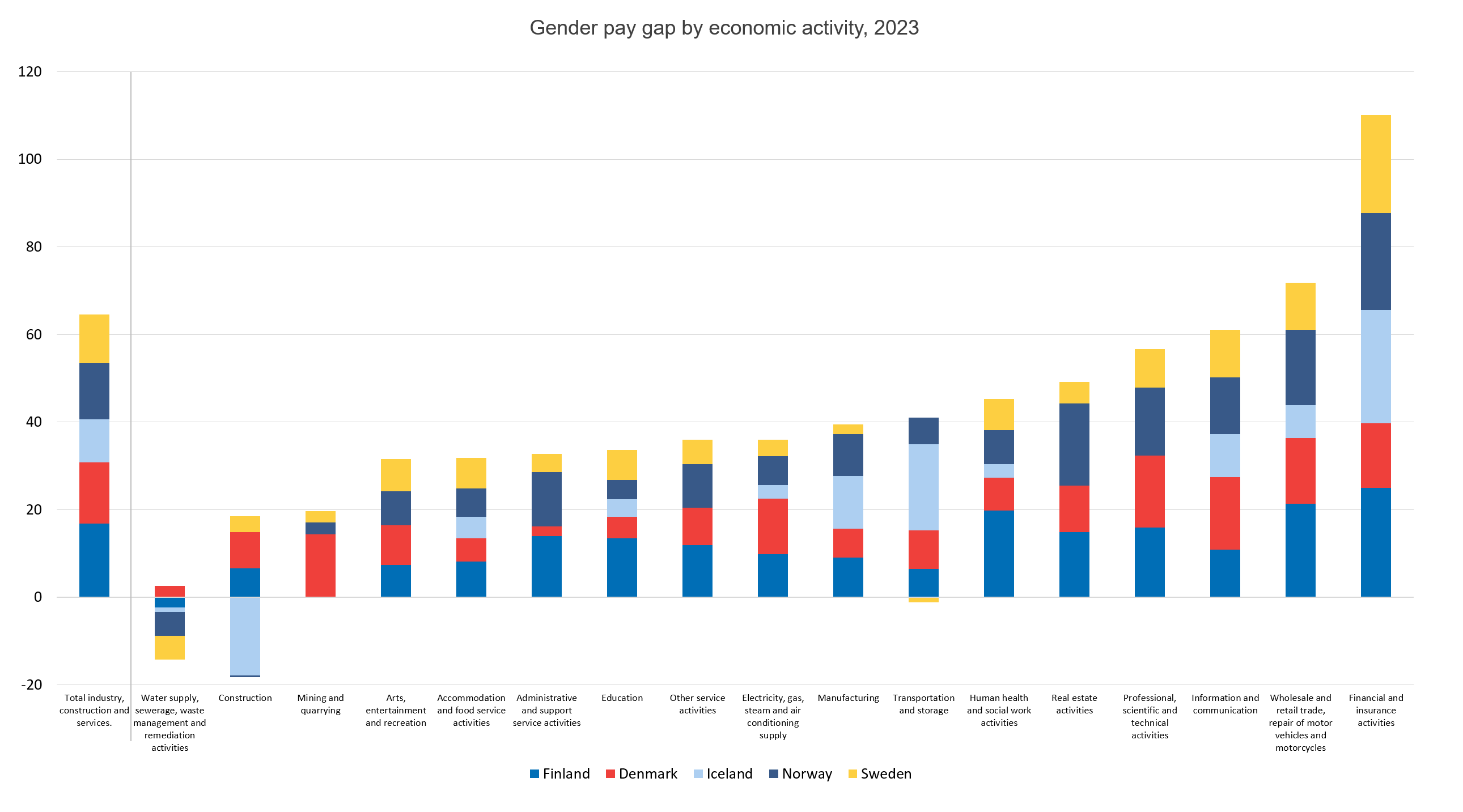 As earlier mentioned, the gender pay gap can also be studied within various economic activities. In the graph below, the gender pay gap is presented for each of these activities in the Nordic countries in 2023. Click on the graph to expand it.