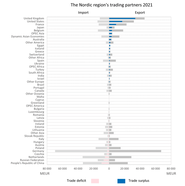 The Nordic region’s trading with other countries has for the last twenty years continuously resulted in a trade surplus. Germany is the most important trading partner both in terms of export and import trade values.
