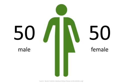 If 100 persons lived in the Nordics 50 would be male and 50 would be female.