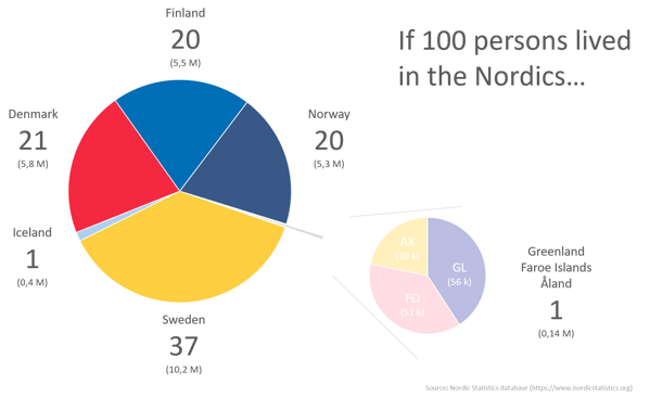 If 100 persons lived in the Nordics 37 would be Swedish, 21 would be Danish, 20 would be Finnish, 20 would be Norwegian, 1 would be Icelandic and 1 would be either Greenlander, Faroese or Ålander.