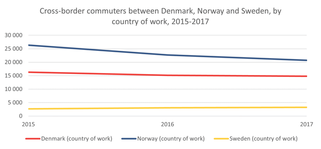 In 2015 a total of 45 300 people cross-border commuted between the three countries. In 2017, that number was down to 38 800. It is the flow to Norway that has declined most, from 26 300 in 2015 to 20 700 in 2017. The flow to Denmark has also declined, from 16 300 to 14 800, while the flow to Sweden has increased slightly from 2 700 to 3 300. Whether this is natural variation, or a downward trend is difficult to say, for that more data is needed.