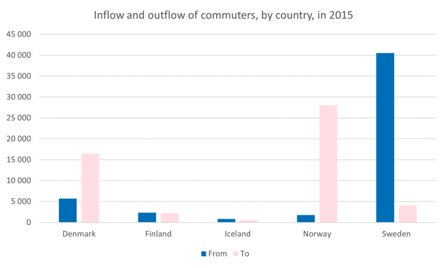 Commuting at the Nordic level is dominated by the flow of commuters from Sweden to Norway and Denmark, which accounted for 75 percent of all the commuting in the Nordic area in 2015.