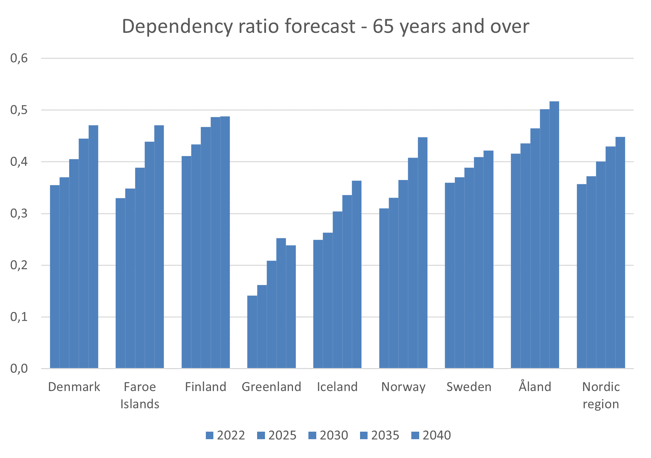At the Nordic level, the total dependency ratio is forecasted to 0.75 in 2022 and it is expected to increase to just over 0.80 in 2040. This means that in 2022 every Nordic person of working age will need to support him- or herself and 0.75 persons more in 2022 and 0.80 persons more in 2040. Greenland has the lowest total dependency ratio in 2022 being 0.57 while Faroe Islands has the highest total dependency ratio in 2022 with 0.84. In 2040 these ratios are expected to increase to 0.66 and 0.97, still the lowest and the highest ratio, respectively.