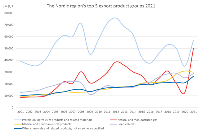 In 2021, the combined value of the exports of the Nordic region was around 460 billion euros. Correspondingly, the combined value of the region’s imports was 395 billion euros. In both cases this is an all-time high. The commodity group with the highest export value during the year was Petroleum, petroleum products and related materials while the group with the highest import value was Road vehicles.