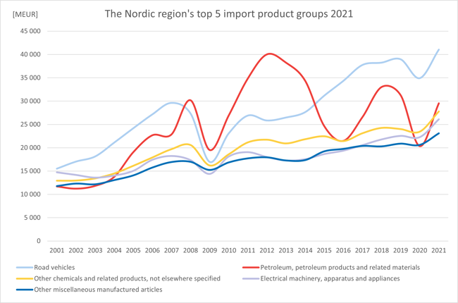 Petroleum, petroleum products and related materials and Other chemicals and related products, not elsewhere specified are also important product groups for the Nordic region, each accounting for 6-8 percent of all import during recent years.
