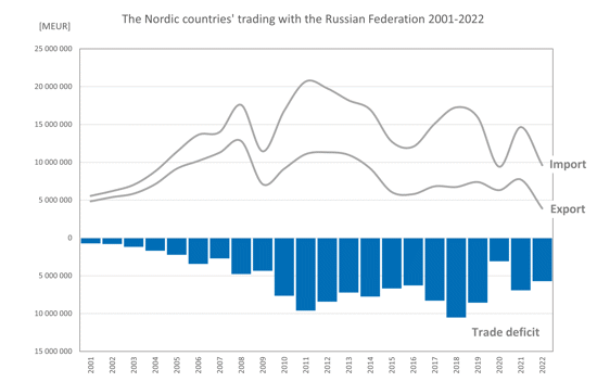Exports were similarly down, with drops varying between 93 percent in Iceland and 39 percent in Norway. The total value of Nordic exports to Russia in 2022 was 3.9 billion, a decrease by 50 percent compared to the previous year.