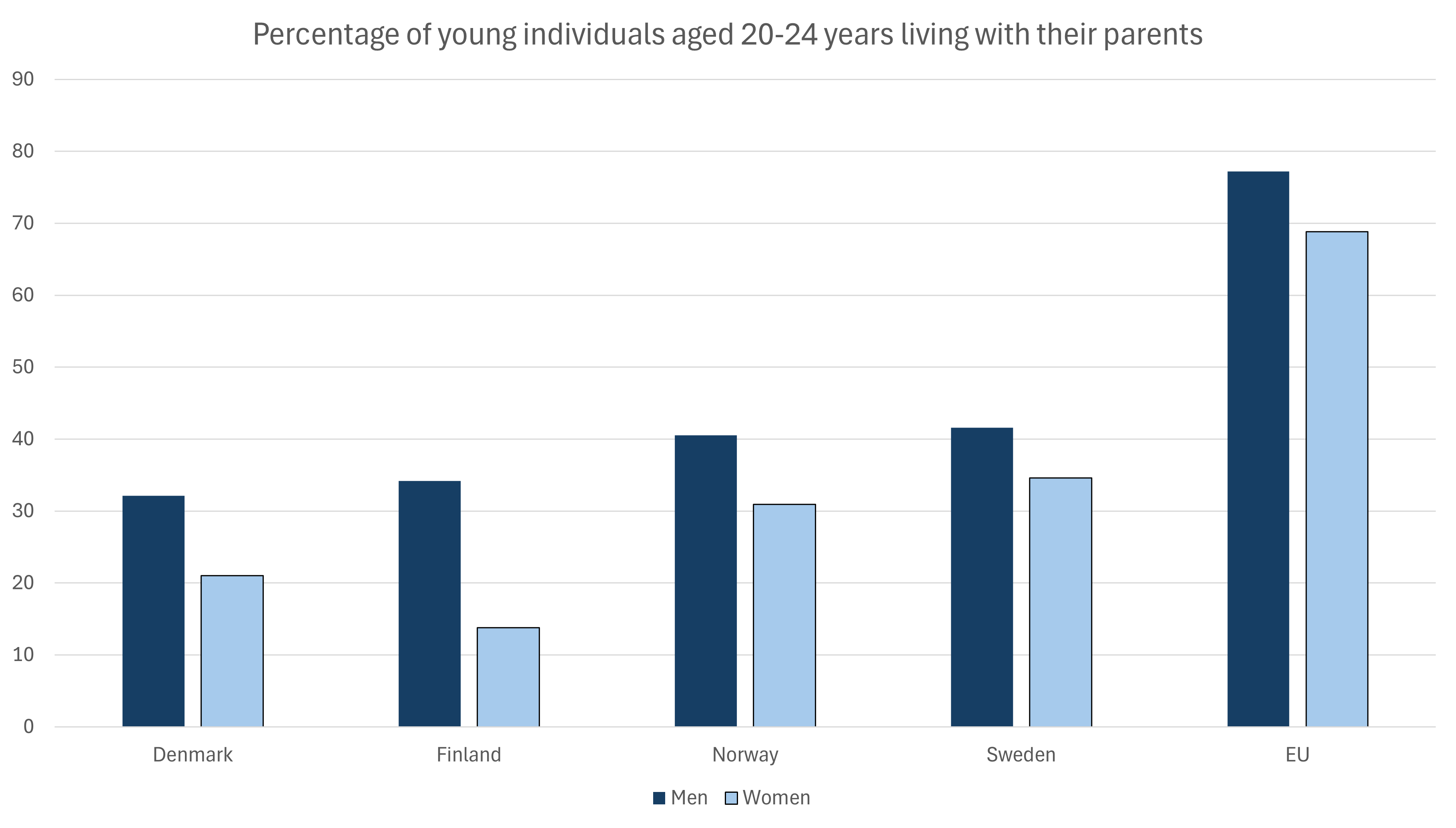 Men aged 20–24 are more likely than women to live with their parents in all represented countries as well as in the EU. In 2024, Finland displays the largest gender gap at 20 percentage points. Sweden, on the other hand, displays the smallest gap at 7 percentage points.