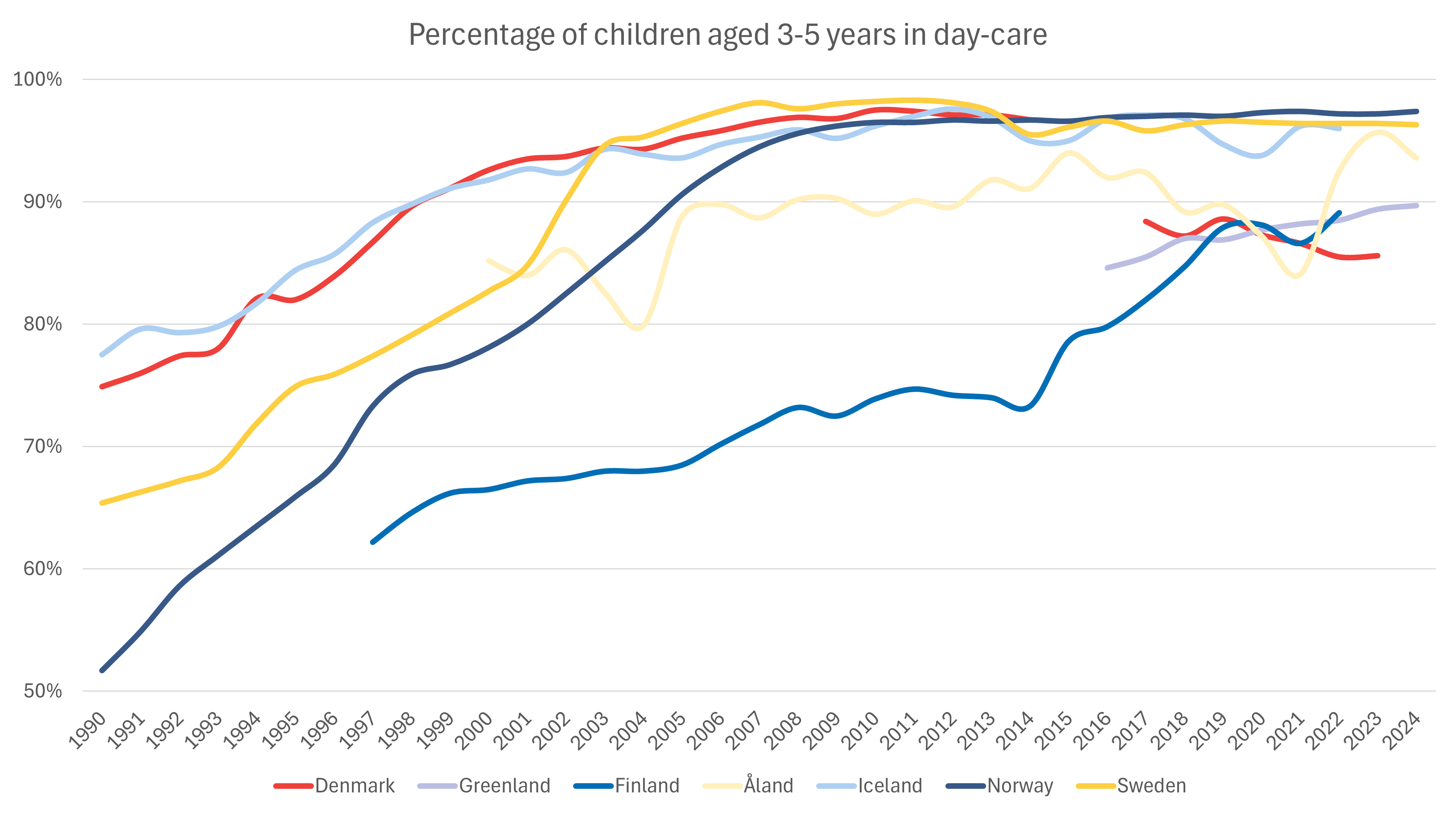 The proportion of children in day care has increased significantly in most Nordic countries over the past decades. The largest increase can be observed in Norway, where the proportion of 3-5-year-olds in day care has practically doubled since 1990.