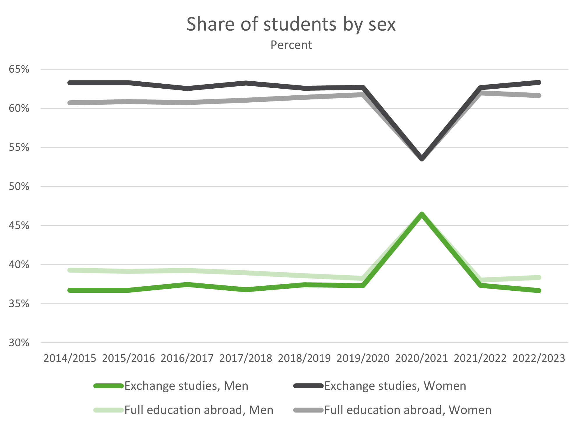 Women participate in education abroad to a greater extent than men. The distribution between men and women has been very steady over time, with exception for the first pandemic year of 2020/2021. For 8 out of 9 years, the share of women has been 61-62% for Full education abroad and 63% for Exchange studies. In the academic year of 2020/2021, this changed slightly. The share of women went down, and the share of men went up accordingly for both types of education abroad, but for different reasons.