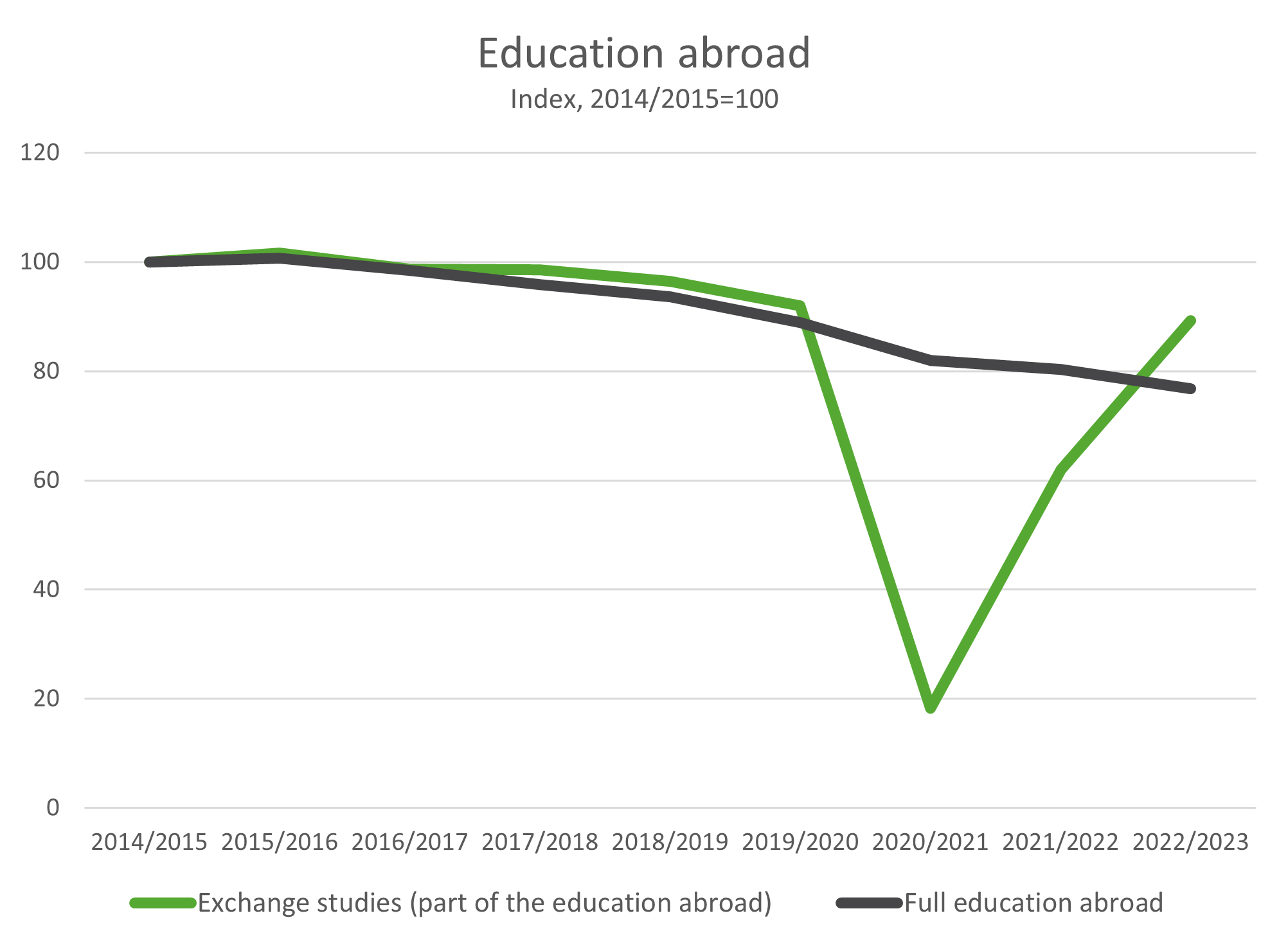 [2] From 2018/2019 the data does not cover more long-term studies abroad for Denmark, but no significant decrease can be seen in the numbers.
