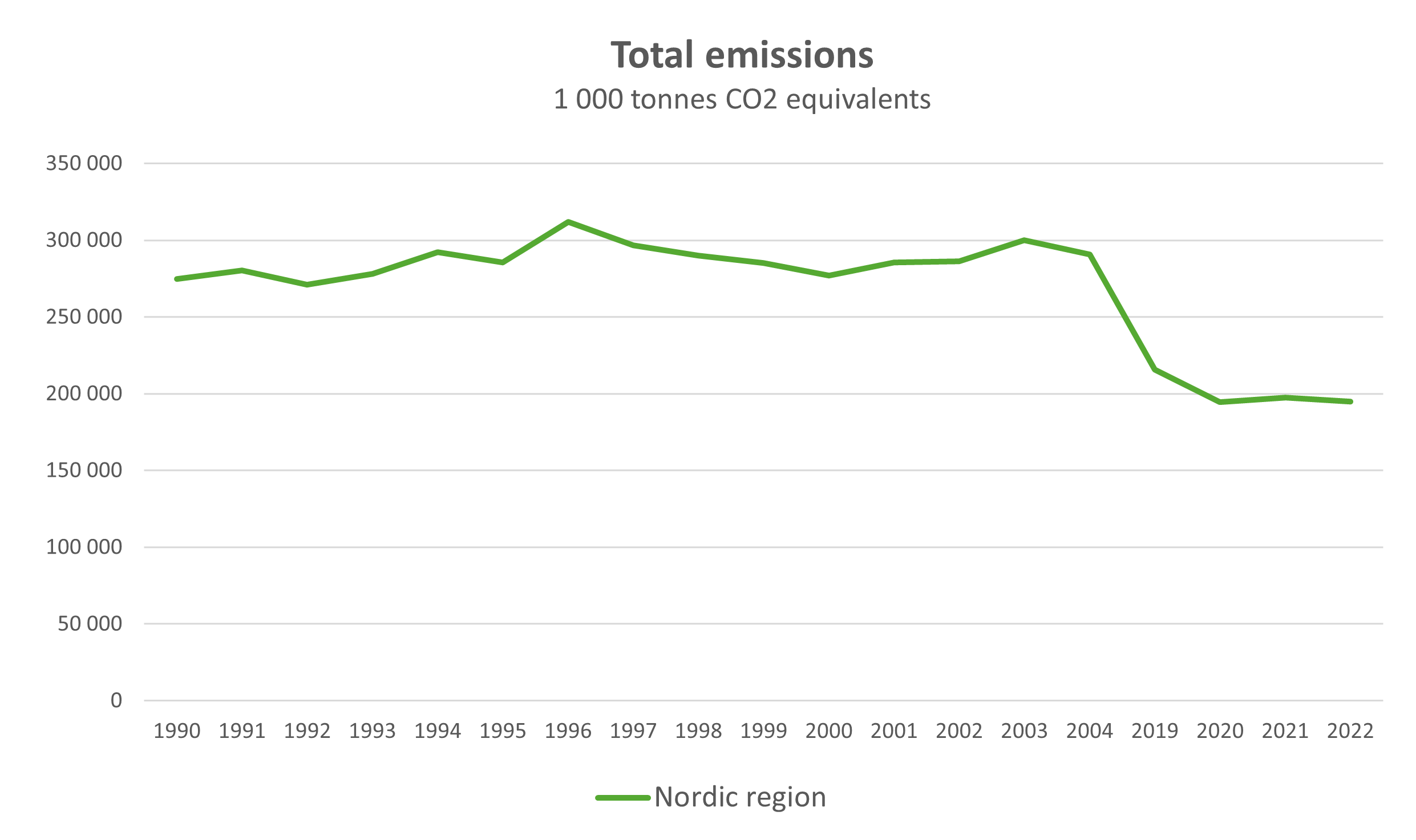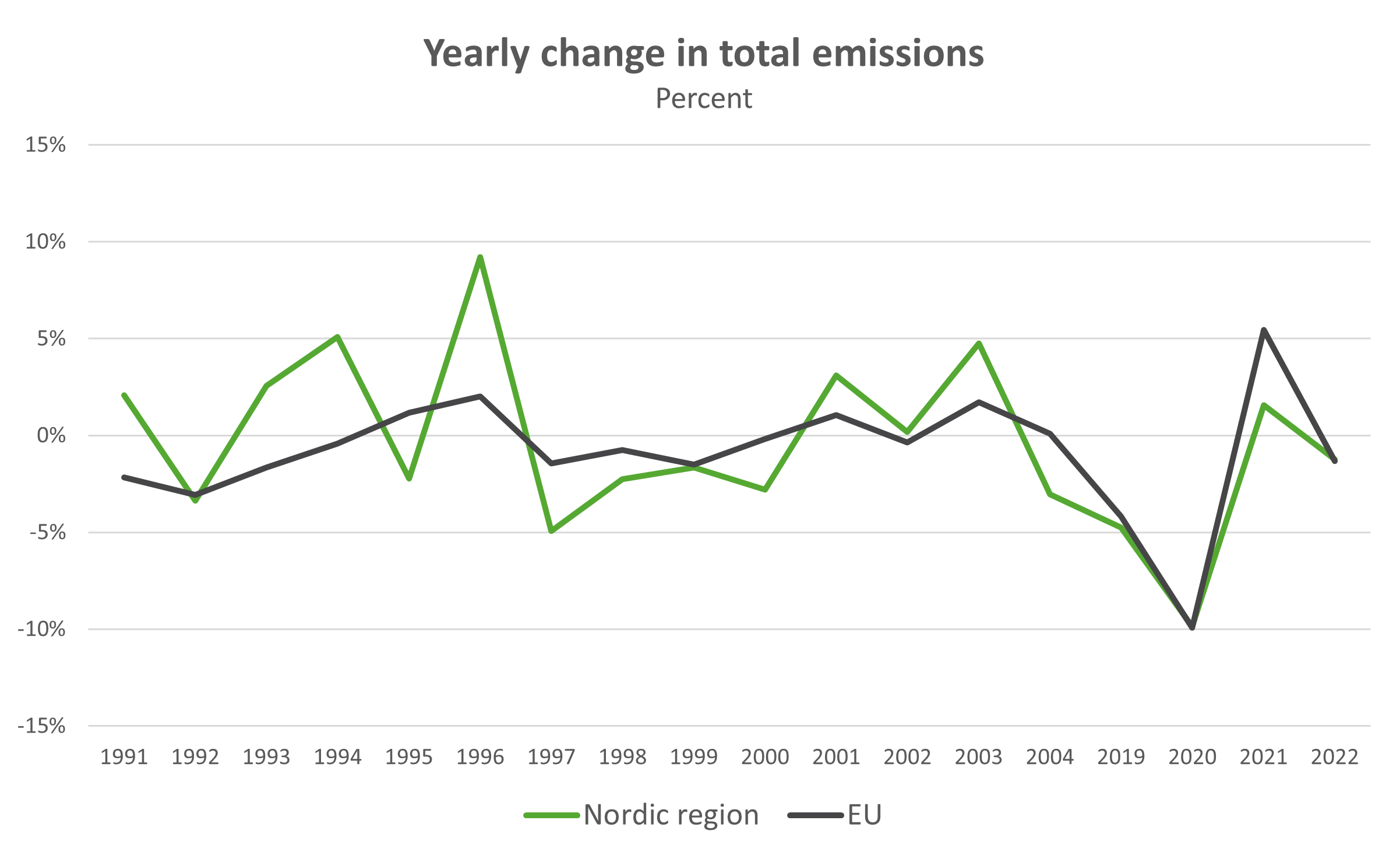 In 2021, emissions rose again, but less in the Nordics than in the EU - by 1.6% compared to 5.4%. In 2022, both the Nordics and the EU reported decreases in line with those pre-pandemic, total emissions were down by 1.25% and 1.3%, respectively, compared to 2021.