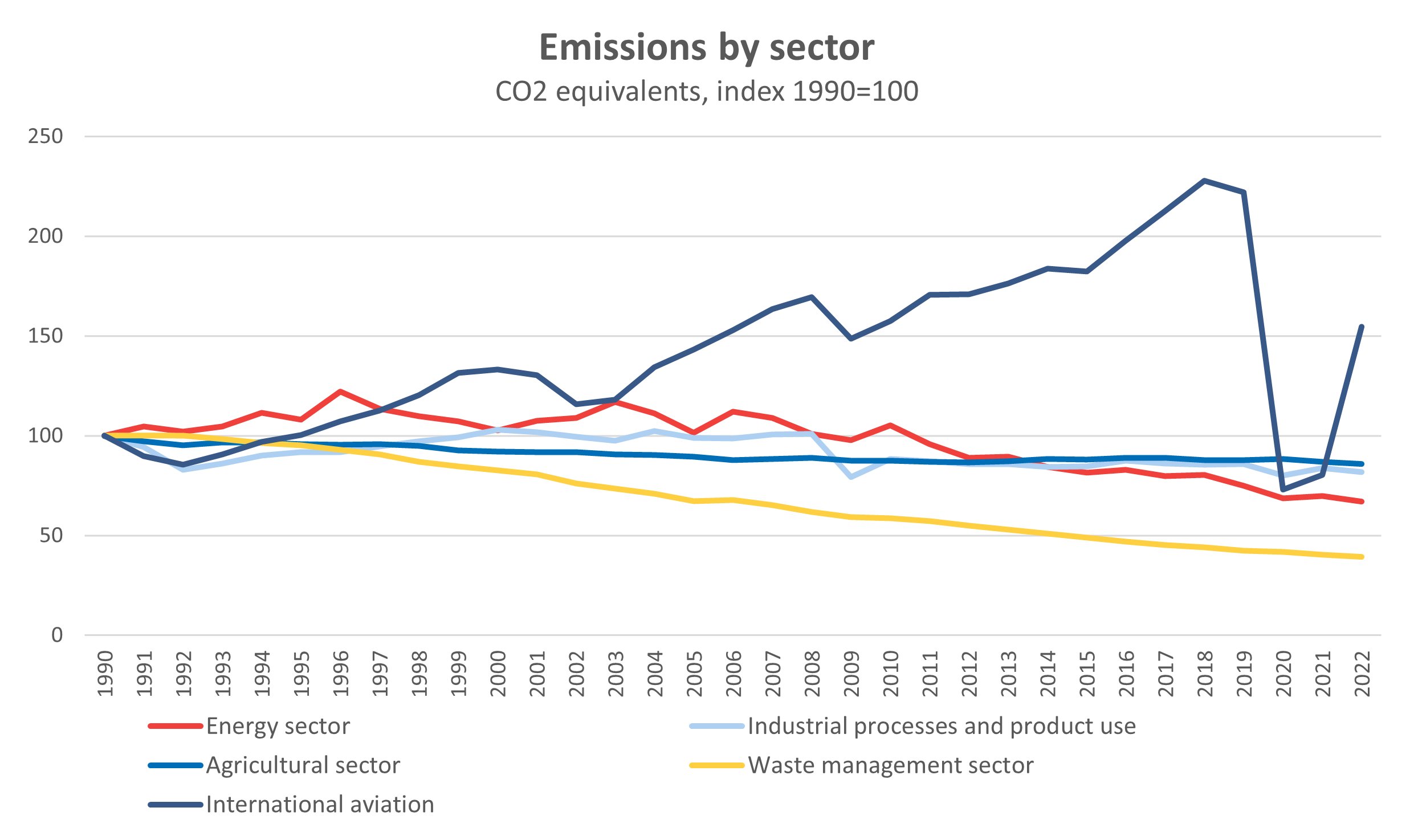 A sector that is much smaller in emissions is International aviation, but this is where the largest relative decline was seen – the emissions from this sector declined by 67% in the Nordic region in 2020. Travelling internationally was heavily restricted in all Nordic countries during the majority of the year. As can be seen below, this was quite the break in trend as this is the only sector that has almost continuously increased its emissions since 1990. In 2021, a small increase could be seen, but the big jump came in 2022, when many seem to have returned to pre-pandemic travel habits (albeit not all).
