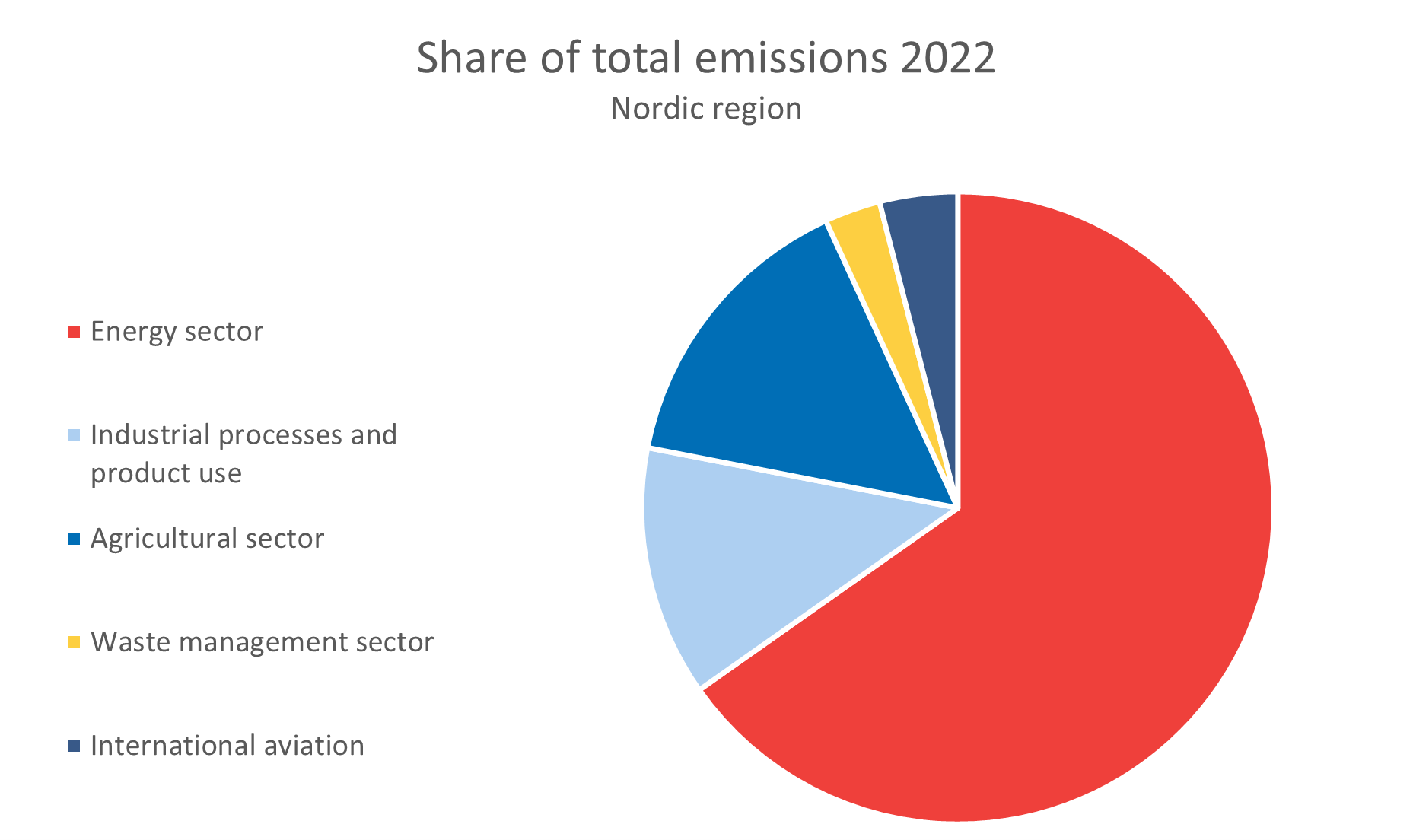 When analysed by sector, the Energy sector accounts for the by far largest emissions, 65% of the total in the Nordic region in 2022. Industrial processes and product use and the Agricultural sector have similar shares, 13 and 15% respectively, while Waste management accounts for 3% and International aviation for 4%.