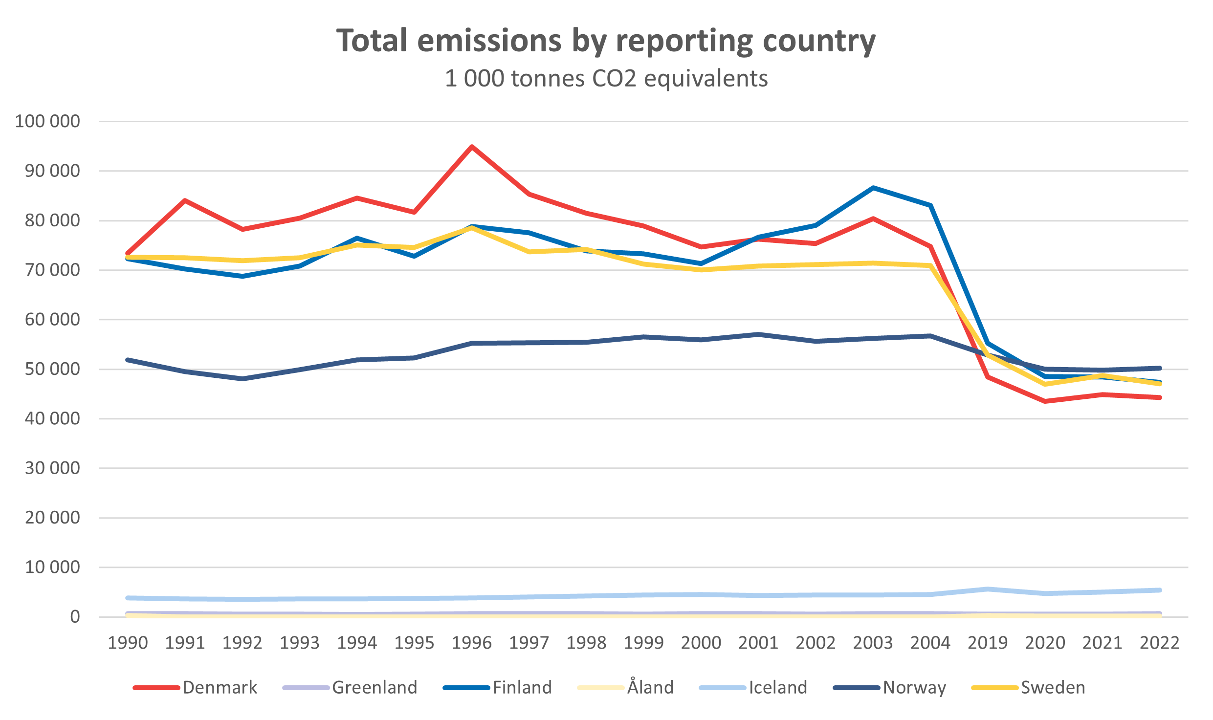 The decline from 2019 to 2020 in the separate countries varied between 3%, in Greenland, and 16%, in Iceland. Since, comparing 2020 with 2022, total emissions have declined even further in Finland, by 2%, remained roughly at 2020 levels in Sweden, Norway and Denmark and increased in Greenland and Iceland, by 13 and 14%, respectively. In the EU, total emissions in 2022 were 4% higher than in 2020.