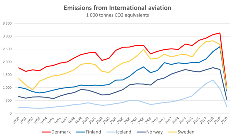 International aviation accounts for a small share of emissions for most countries, one to two percent for Denmark, Finland, Norway and Sweden and six percent in Iceland in 2020. But the part that International aviation plays in the 2020 drop in emissions is large, between 26 percent in Finland and 78 percent in Iceland.