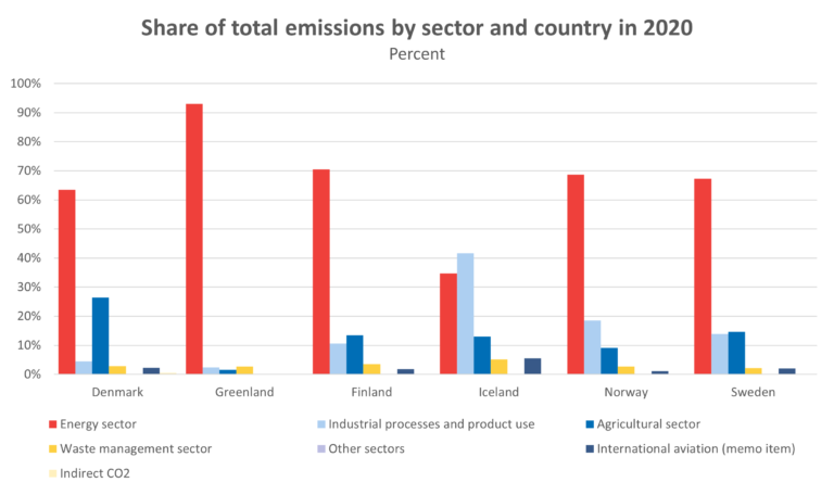 Please note that Faroe Islands has been excluded from the analysis completely, because there is no data available. The Nordic region is here therefore comprised of seven countries. Åland has data on total emissions but not per sector. Åland is however also included in the figures for Finland, so the values per sector for the Nordic region are complete.