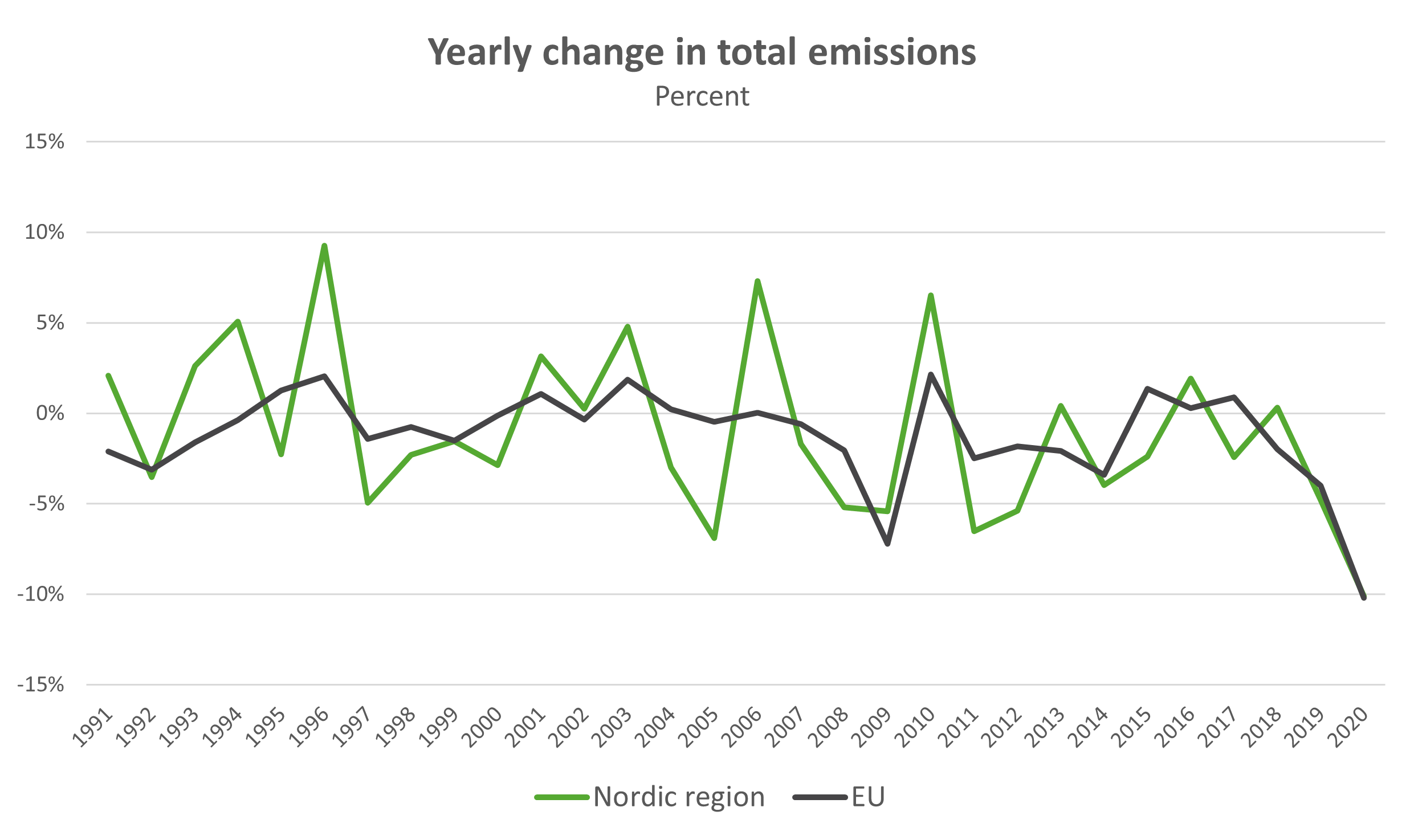 The trend has been downward for almost 20 years, but the decline in 2020 was larger than would have been expected under normal circumstances. The Figure below shows the change in total emissions compared to the previous year, in percent, for the Nordic region and the EU. In 2020 emissions in both the Nordic region and the EU as a whole was down by over ten percent. In the Nordic region the average yearly change since 1990 has been -1.05 percent and in the EU -1.22 percent.