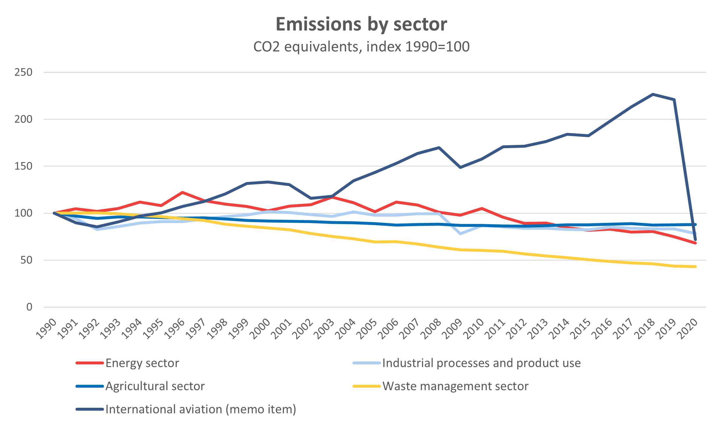 The Energy sector has the largest share of emissions in all countries except Iceland, where Industrial processes and product use is larger. In the same way, the decline in emissions, measured in CO2 equivalents, is greatest for the Energy sector in all countries with the exception for Iceland. Here the drop in emissions from International aviation accounted for the majority of the total drop.