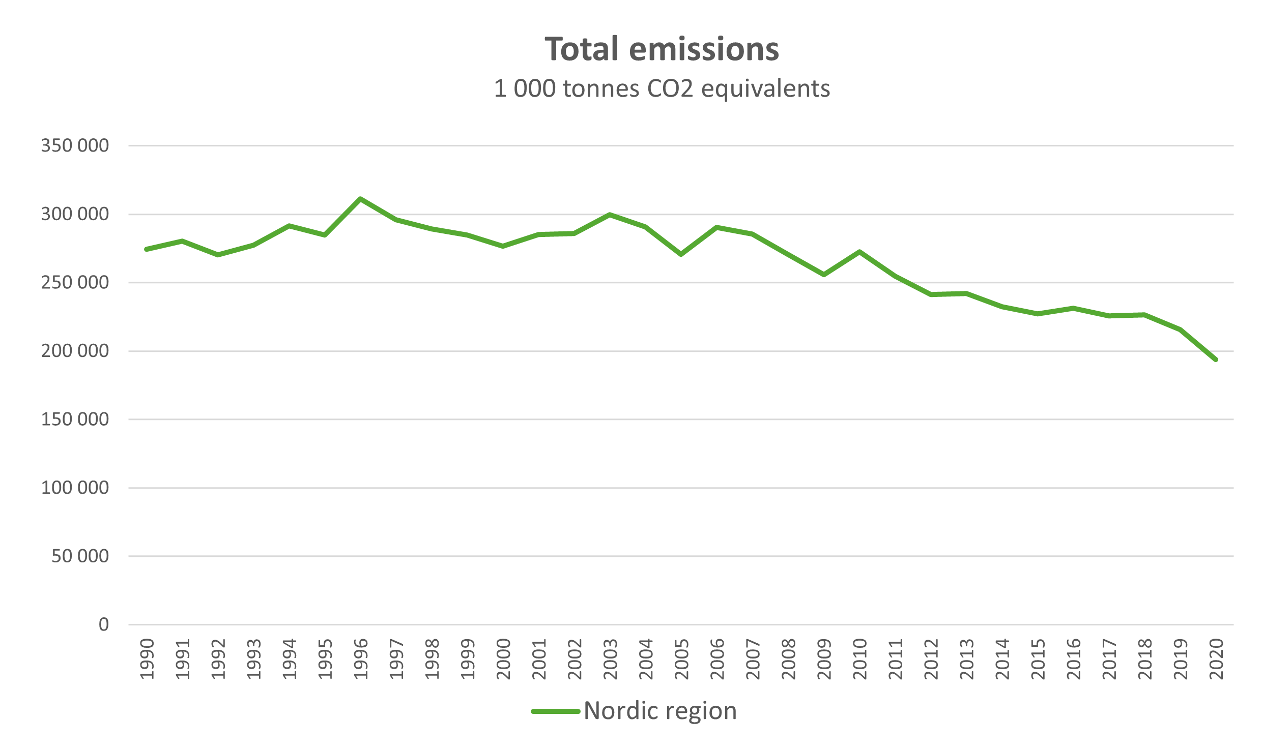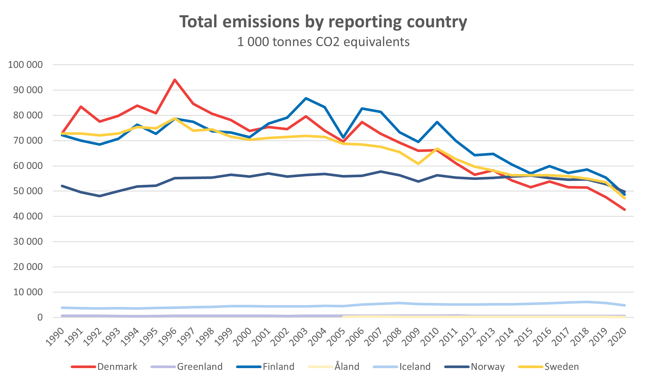 Source: Nordic Statistics Database, EMIS11: Greenhouse gases, national emissions in 1000 tonnes CO2 equivalents by reporting country, sector and time.