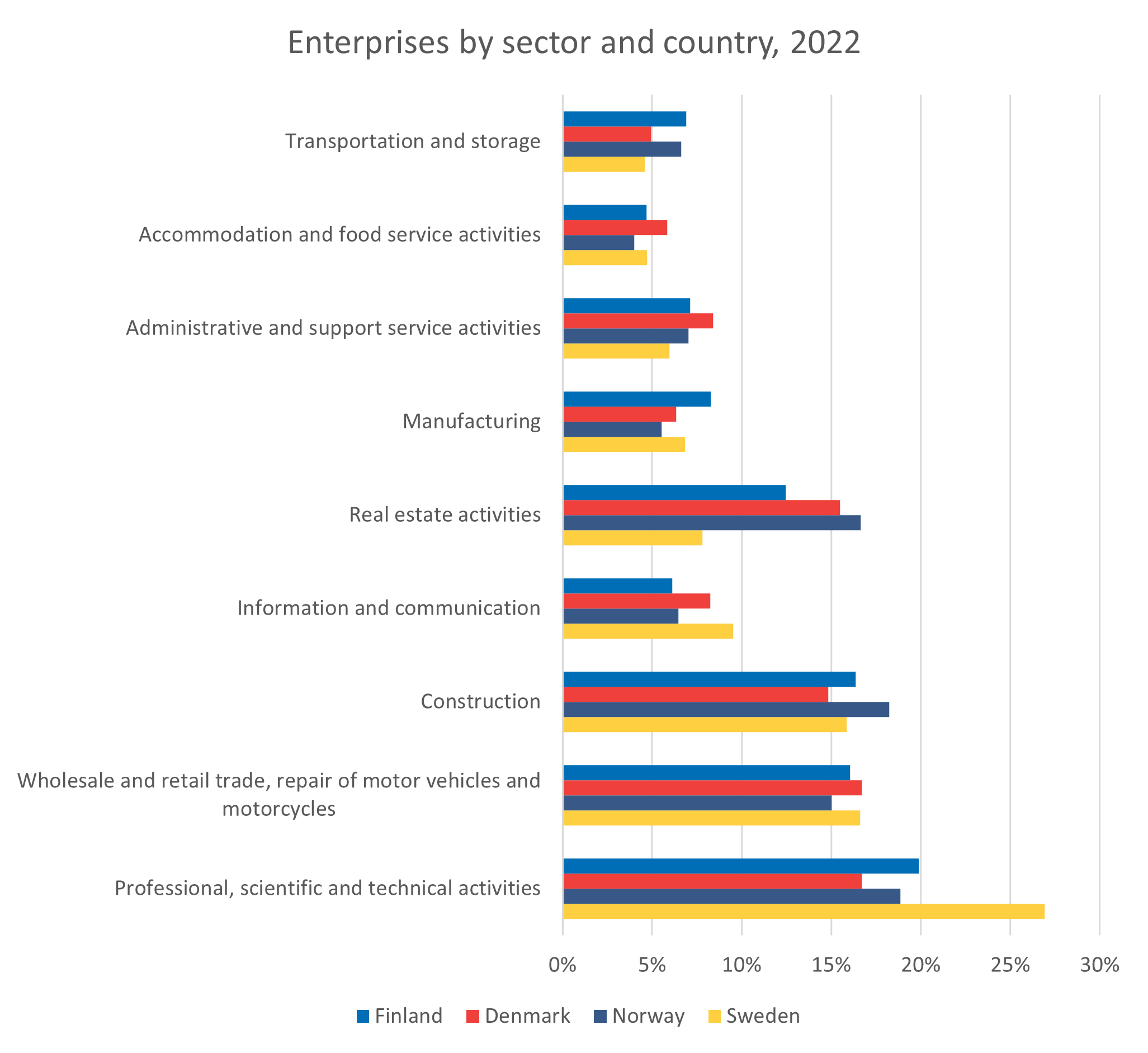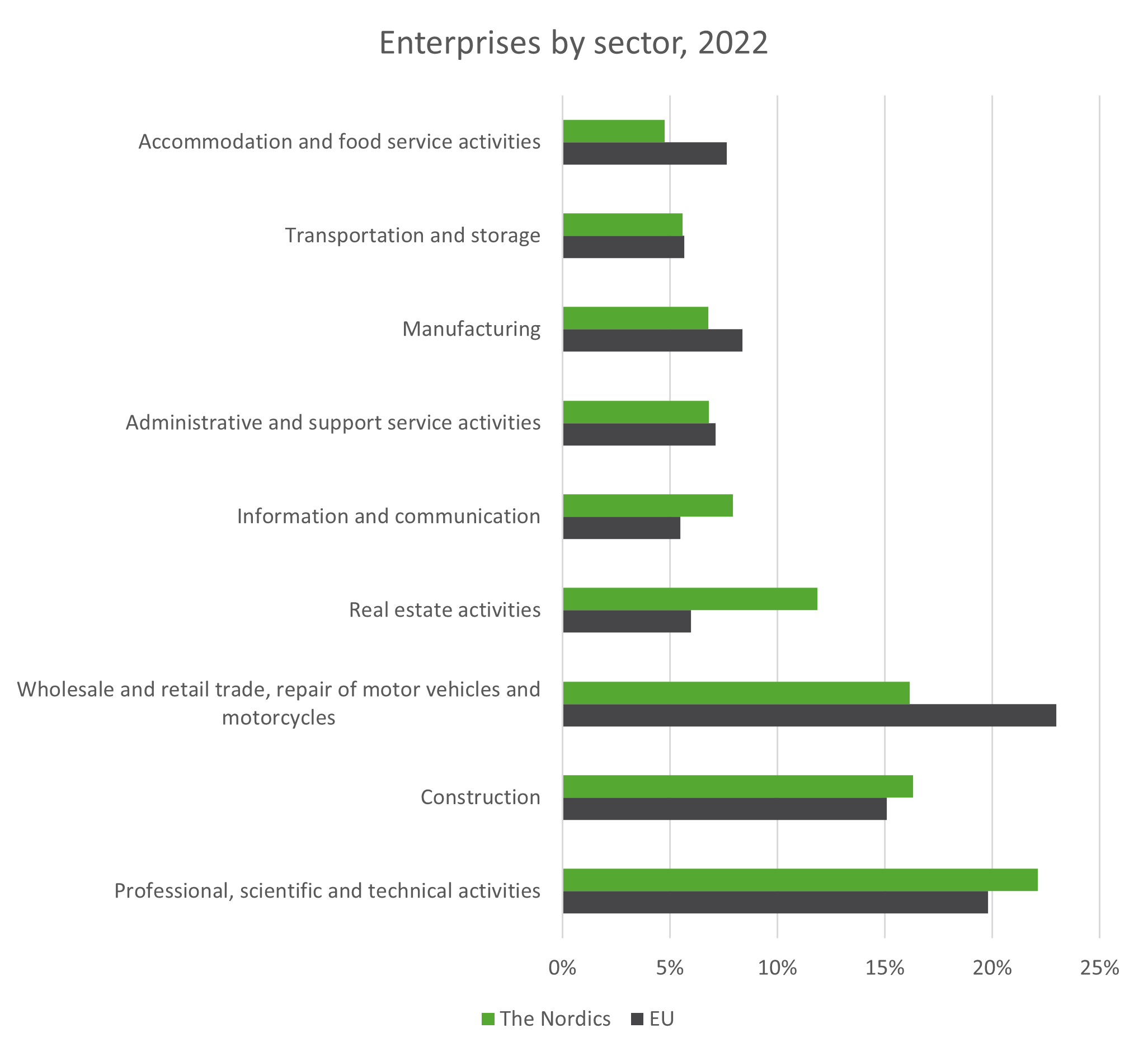 In the Nordics, Professional, scientific and technical activities is the largest sector, with 22% of enterprises. In the EU, the largest sector, with 23%, is Wholesale and retail trade, repair of motor vehicles and motorcycles.