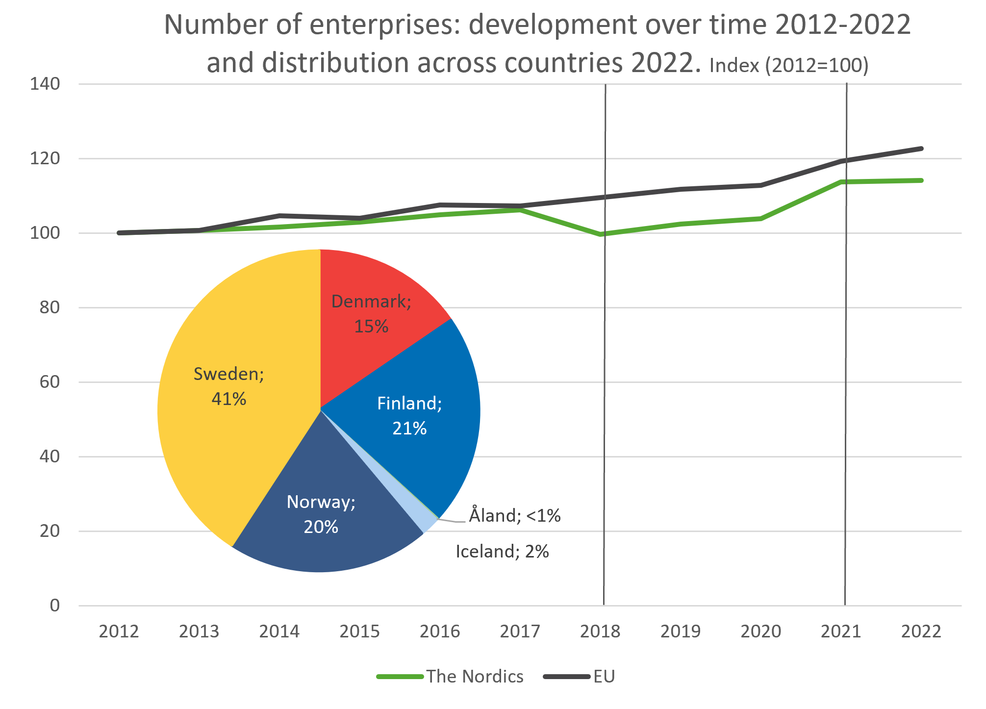 From reference year 2018, all countries are to be fully transitioned from the statistical unit ‘legal unit’ to the ‘enterprise’ unit. This affects, among other countries, Denmark, Norway and Sweden. This caused breaks in the timeseries for the countries affected, and thus for the Nordics and the EU. An enterprise consisting of several legal units will from 2018 and onwards only be counted once, which decreased the number of enterprises for Sweden with 10% and for Norway by 6% between 2017 and 2018. For Denmark the number of enterprises in 2018 was on par with that in 2017.