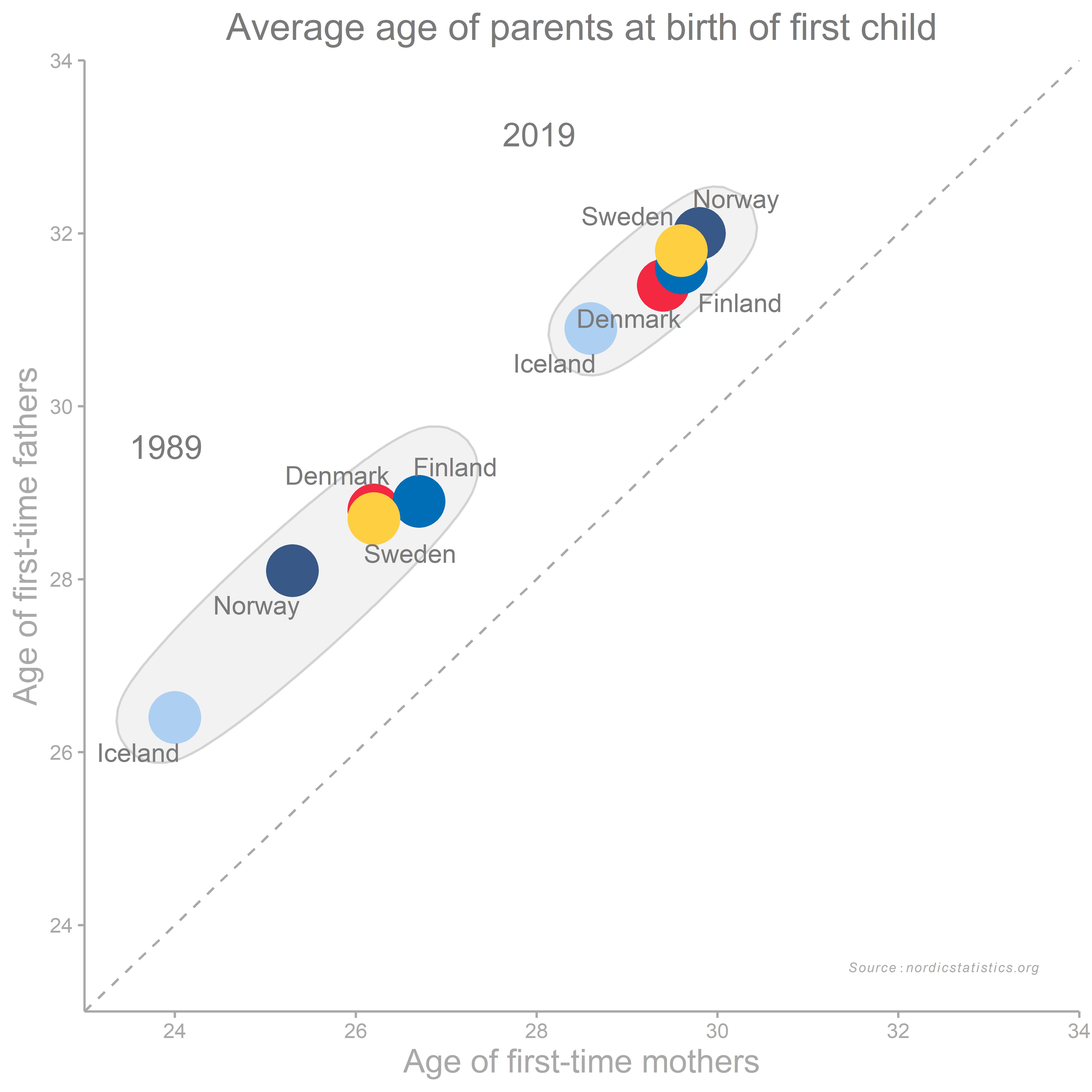 Over the last 30 years the average age of becoming a first-time parent has increased in the Nordic countries. Today, 2019, both mothers and fathers are on average older when they have their first child than they were in 1989. In 1989 as well as today, first-time fathers are on average older than first-time mothers.