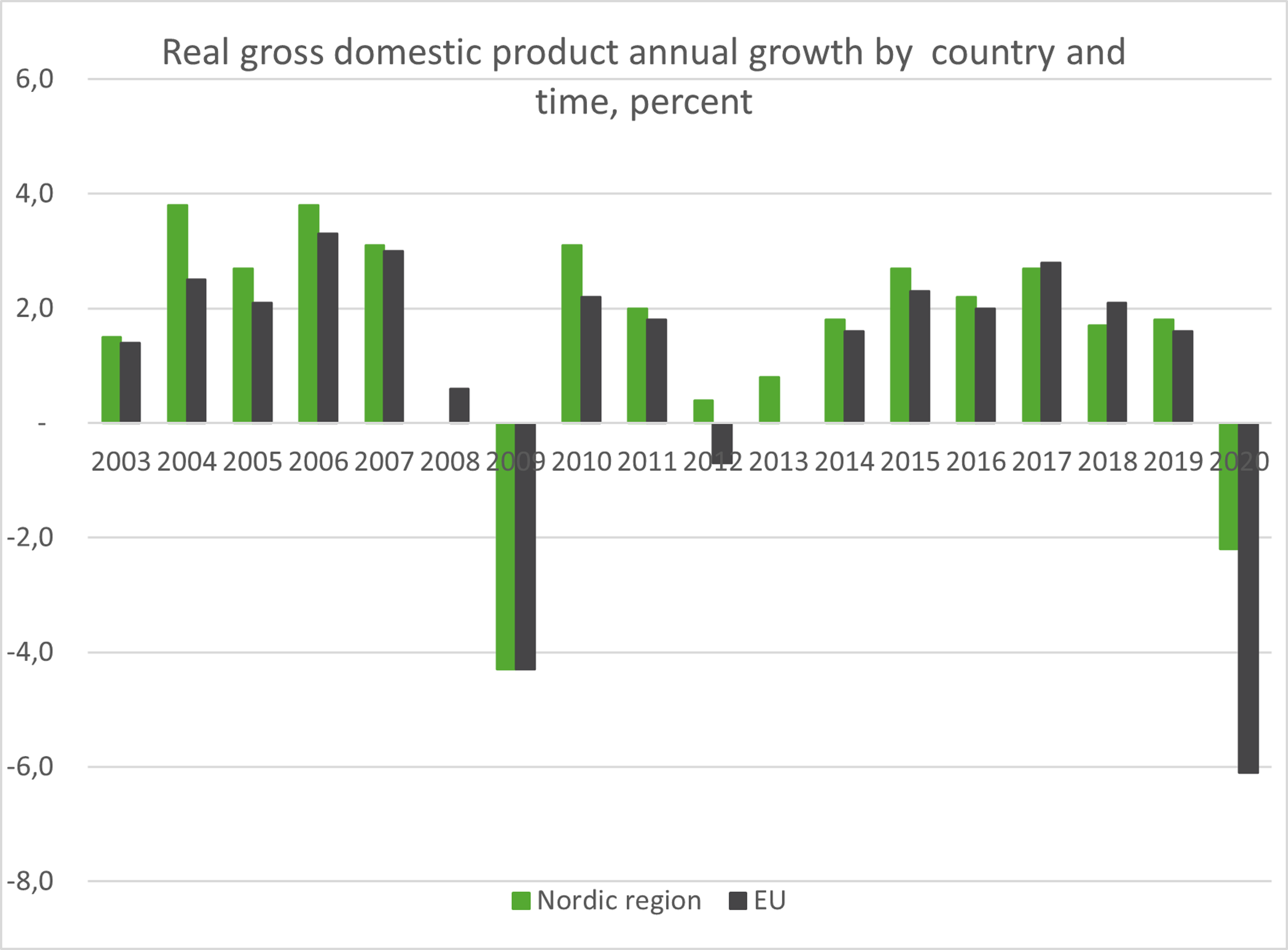 Overall, the Nordic region’s [1] economies have performed better than Europe [2] as a whole with a decline in GDP of 2.2 percent in 2020. The decline in GDP in the EU was 6.1 percent.