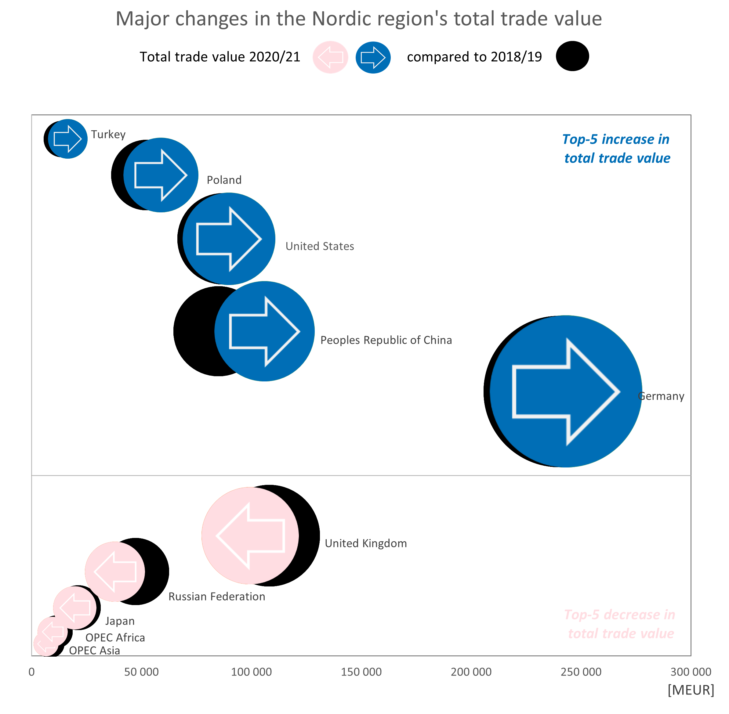 In terms of total trade value (import and export), the top-5 major increases as well as the top-5 decreases are shown in figure 3. In order to balance the probable trading effects during the pandemic, the summarised values from 2018 and 2019 are compared to the summarised values from 2020 and 2021. The blue circles represent a trade surplus for the Nordic region and the light red circles a trade deficit. It is notable that the total trade value between the Nordic region and China has increased the most while the total trade value between the Nordic region and UK and Russia, respectively, has decreased the most.