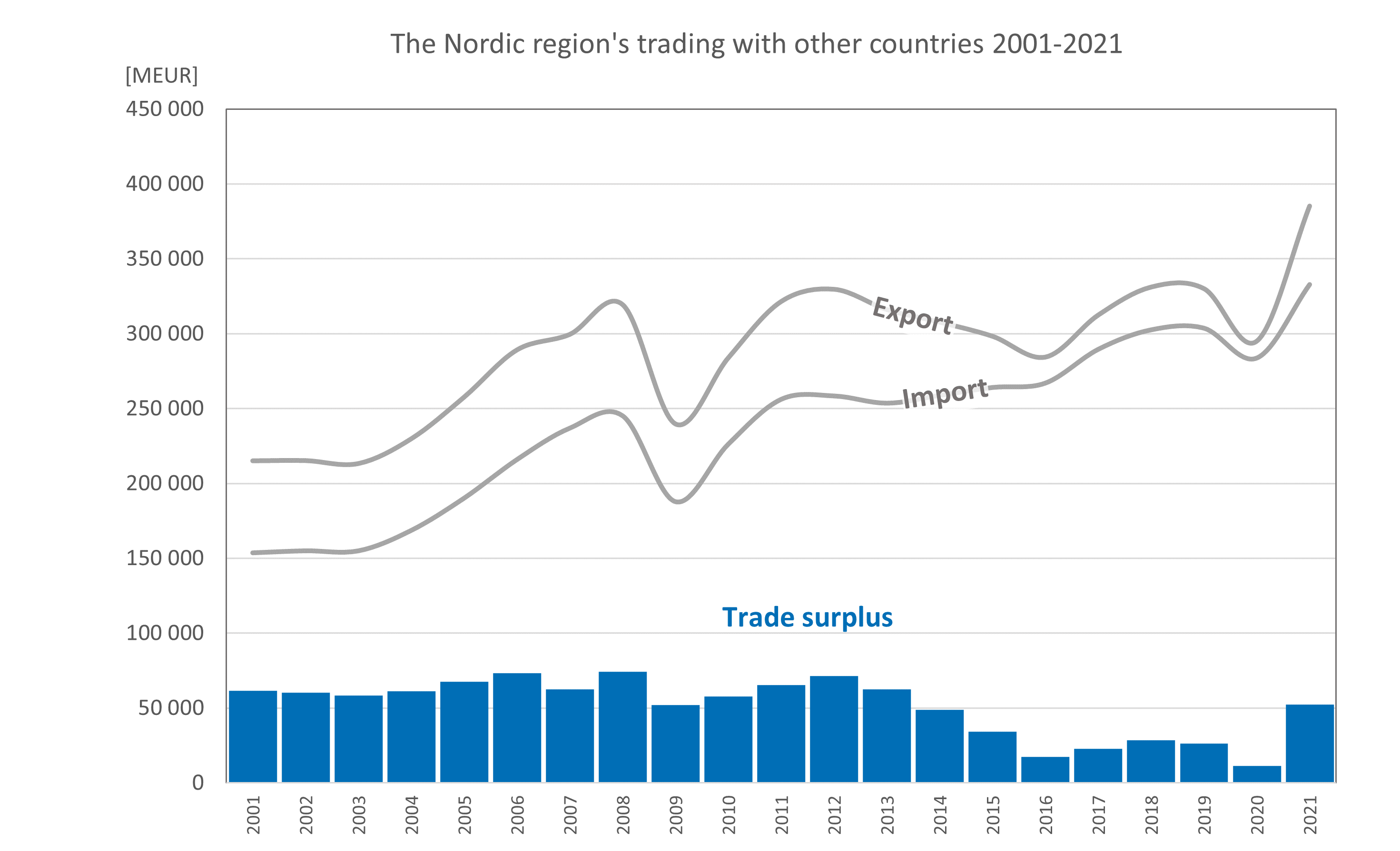 The Nordic region’s trade values have increased during the last twenty years. As seen from figure 1 both the import to and the export from the Nordic region have increased, and the export has exceeded the import resulting in a trade surplus during all years. The trade surplus has decreased in more recent years, especially during the pandemic in 2020. However, probably due to the major decrease during 2020, the trade increased to all-time-high levels during 2021.