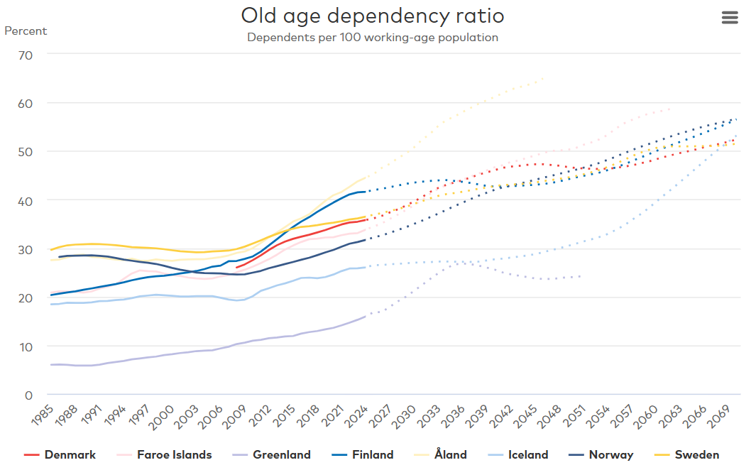 The old age dependency ratio has increased for all Nordic countries since 1985, which implies that the elderly population has grown faster than the working population in all countries. The ratio has been increasing at a higher rate since about 2010, when the large generation born in the 1940s started to reach an age over 65 years. The highest dependency ratios in 2025 can be seen for Åland and Finland. Whereas the lowest dependency ratios can be observed in Greenland and Iceland.