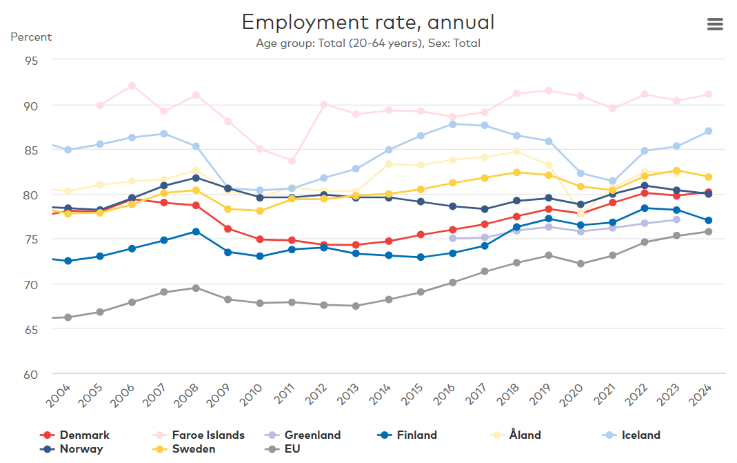 Not surprisingly, all Nordic countries and the EU experienced lower employment rates during the financial crisis in 2009 and the pandemic years 2020 and 2021. In 2024, the employment rate decreased slightly in Sweden, Norway and Finland compared to 2023. In contrast, the employment rate increased in the Faroe Islands, Iceland, Denmark and the EU.