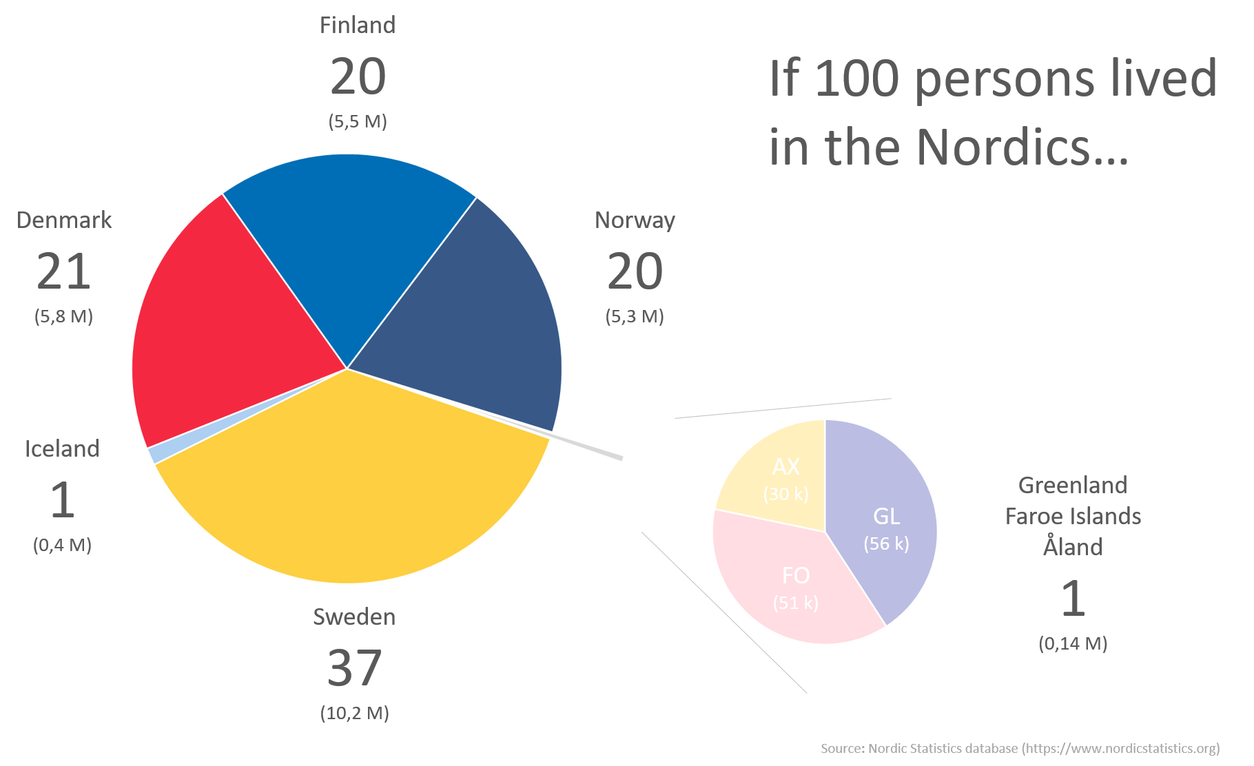 If 100 persons lived in the Nordics 37 would be Swedish, 21 would be Danish, 20 would be Finnish, 20 would be Norwegian, 1 would be Icelandic and 1 would be either Greenlander, Faroese or Ålander.