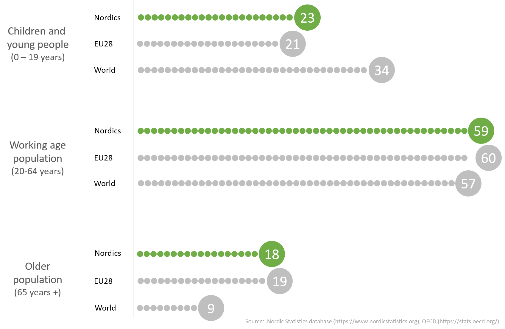 If 100 persons lived in the Nordics 23 would be 19 years or younger, 59 would between 20 and 64 years and 18 would be 65 years or older. As seen in the diagram below the age distribution is similar for the Nordics and the EU28 while on a worldwide basis the younger group is relatively larger and the older group is relatively smaller.