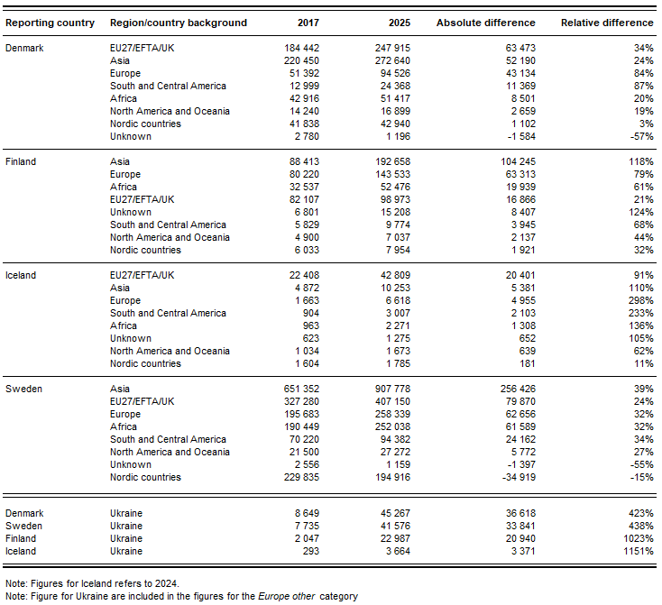 In summary, the foreign-born population has increased in all Nordic countries during the past years. In relative terms, the largest increase can be observed in Iceland. This is especially true for the ‘Europe other’ group, which is primarily explained by an increase of foreign-born with a background in Ukraine. The other represented countries report large increases of foreign-born with a country background in Ukraine too. This can be depicted in the table below, which displays differences in regional backgrounds from 2017 to 2025.