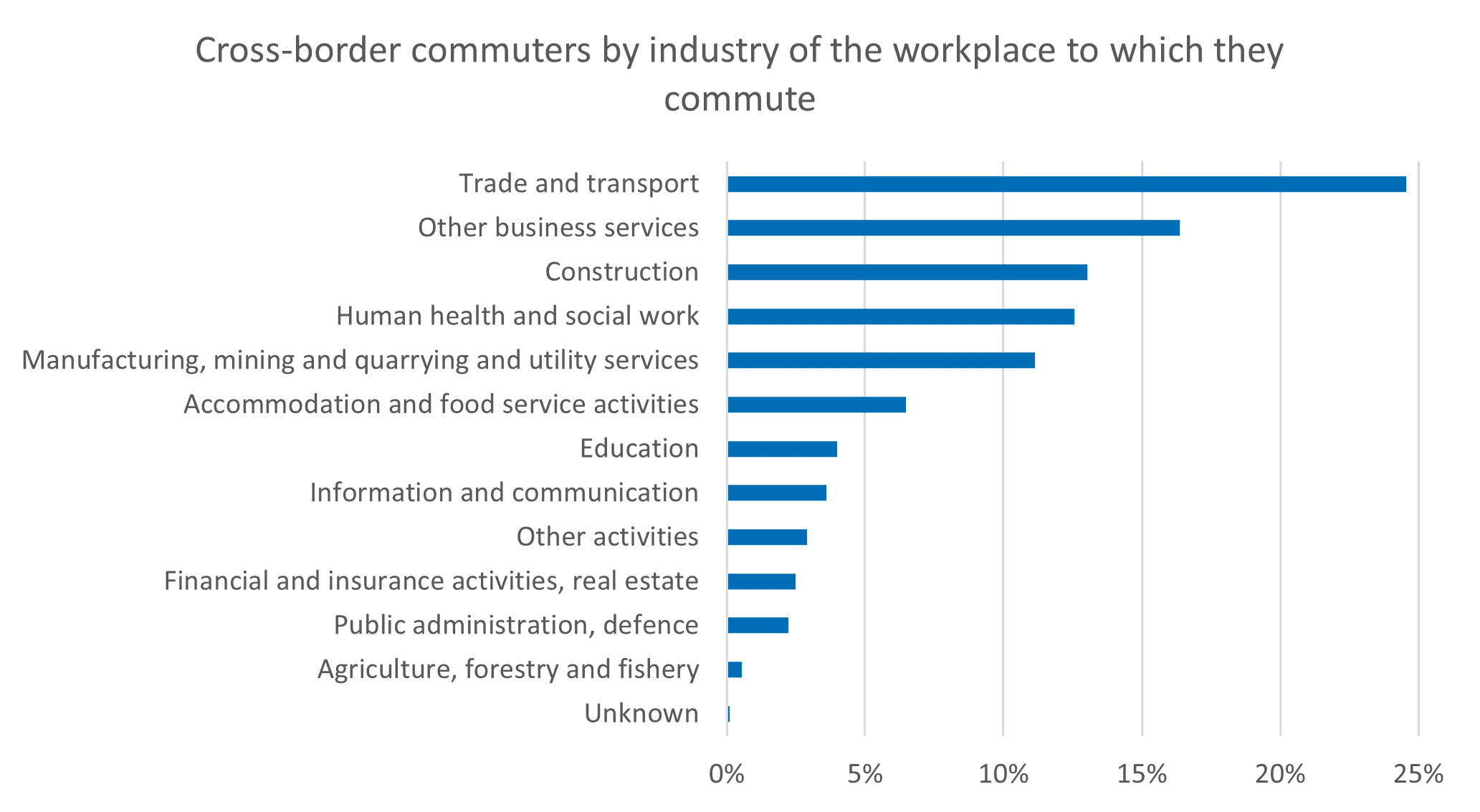 Commuting to a job in Trade and transport is most common, one in every four cross-border commuters does so. The group Other business services is the second largest, covering among other things temporary employment agencies. It can be convenient to use this as a gate to jobs in a foreign country. Construction, Human health and social work and Manufacturing, mining and quarrying and utility services are three other large sectors that attract between 11 and 16 percent of the commuters each.