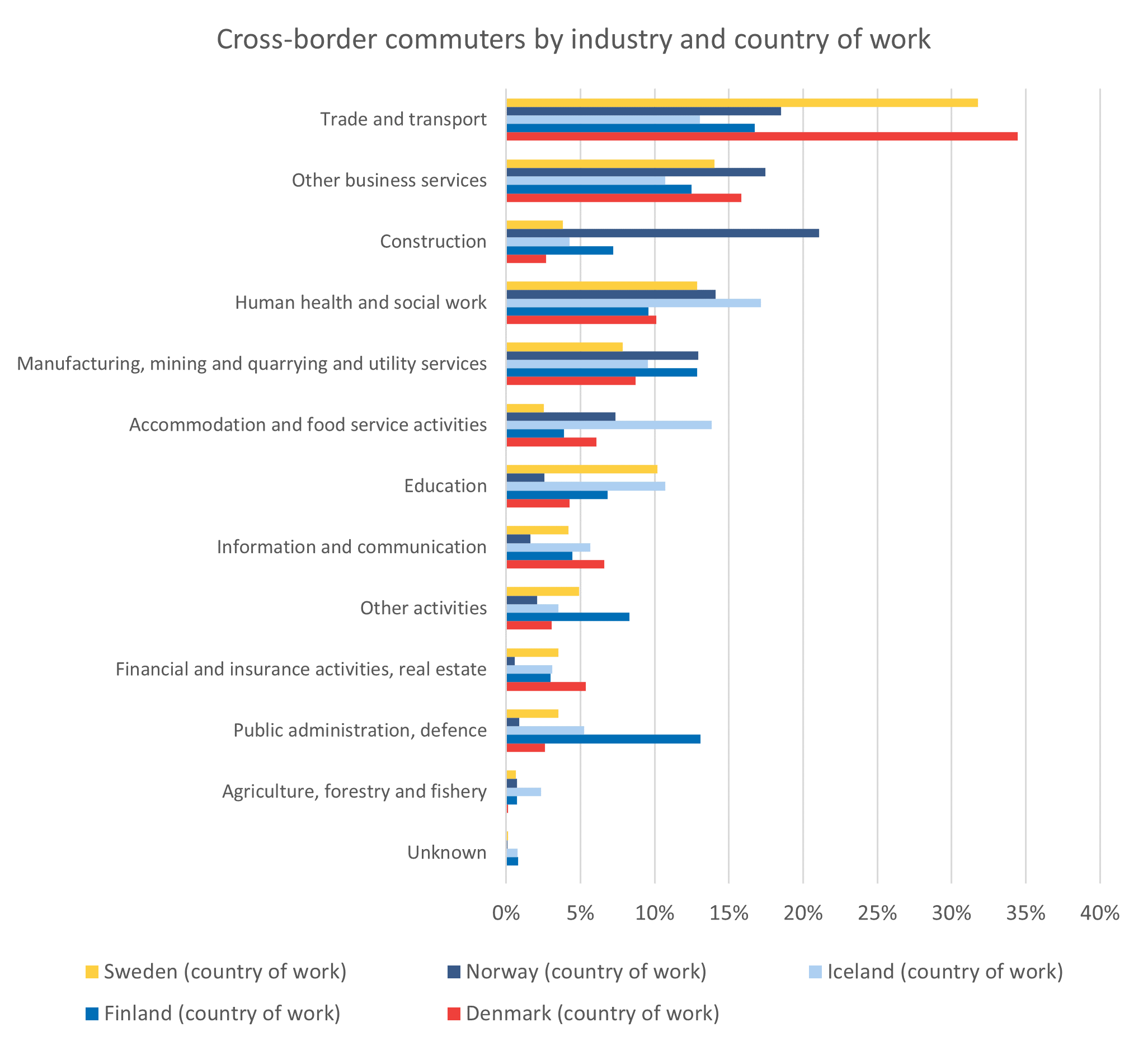 The largest industry of work in Iceland was Human health and social work with 17 percent of the commuters. In second place came Accommodation and food service activities with 14 percent, a sector that was much smaller in the other countries. Trade and transport came in third place with 13 percent.