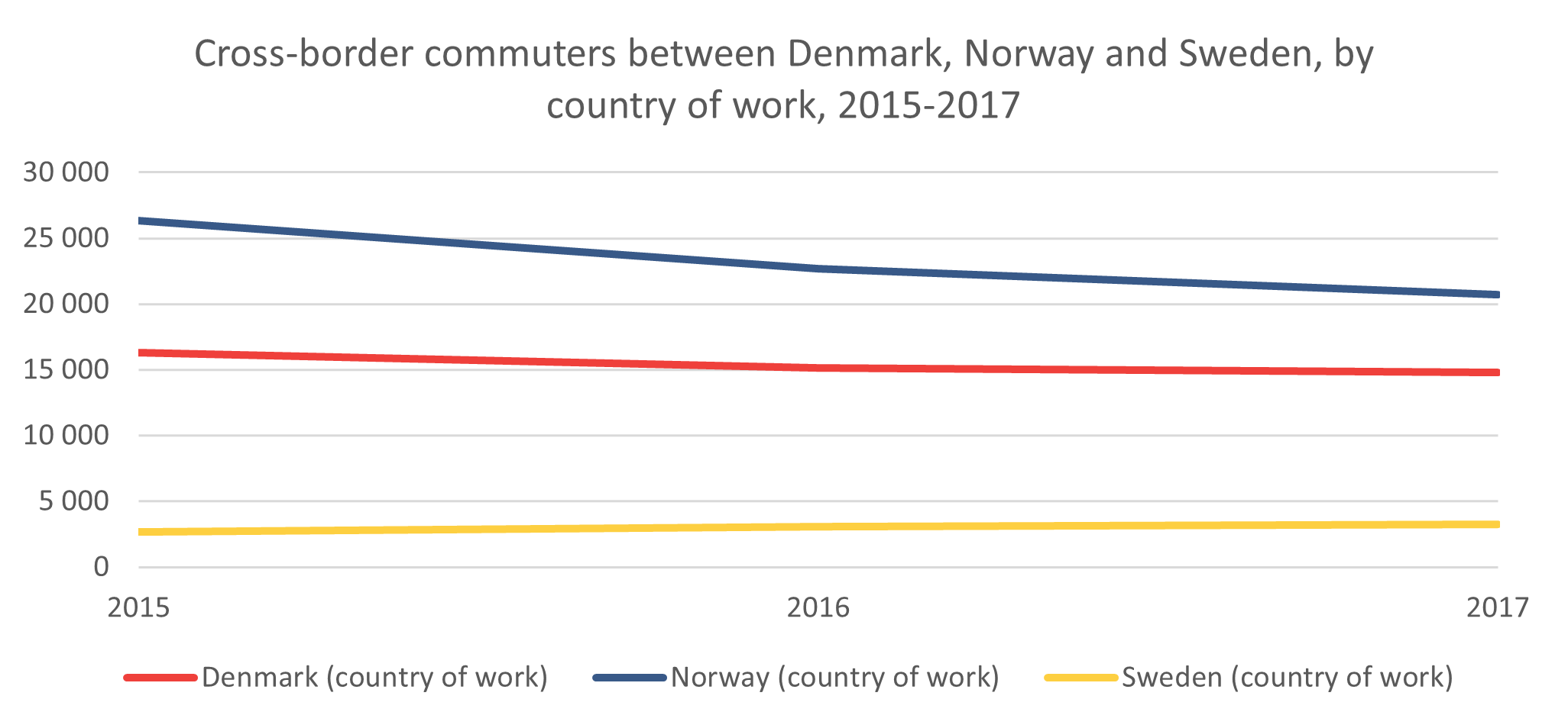 In 2015 a total of 45 300 people cross-border commuted between the three countries. In 2017, that number was down to 38 800. It is the flow to Norway that has declined most, from 26 300 in 2015 to 20 700 in 2017. The flow to Denmark has also declined, from 16 300 to 14 800, while the flow to Sweden has increased slightly from 2 700 to 3 300. Whether this is natural variation, or a downward trend is difficult to say, for that more data is needed.