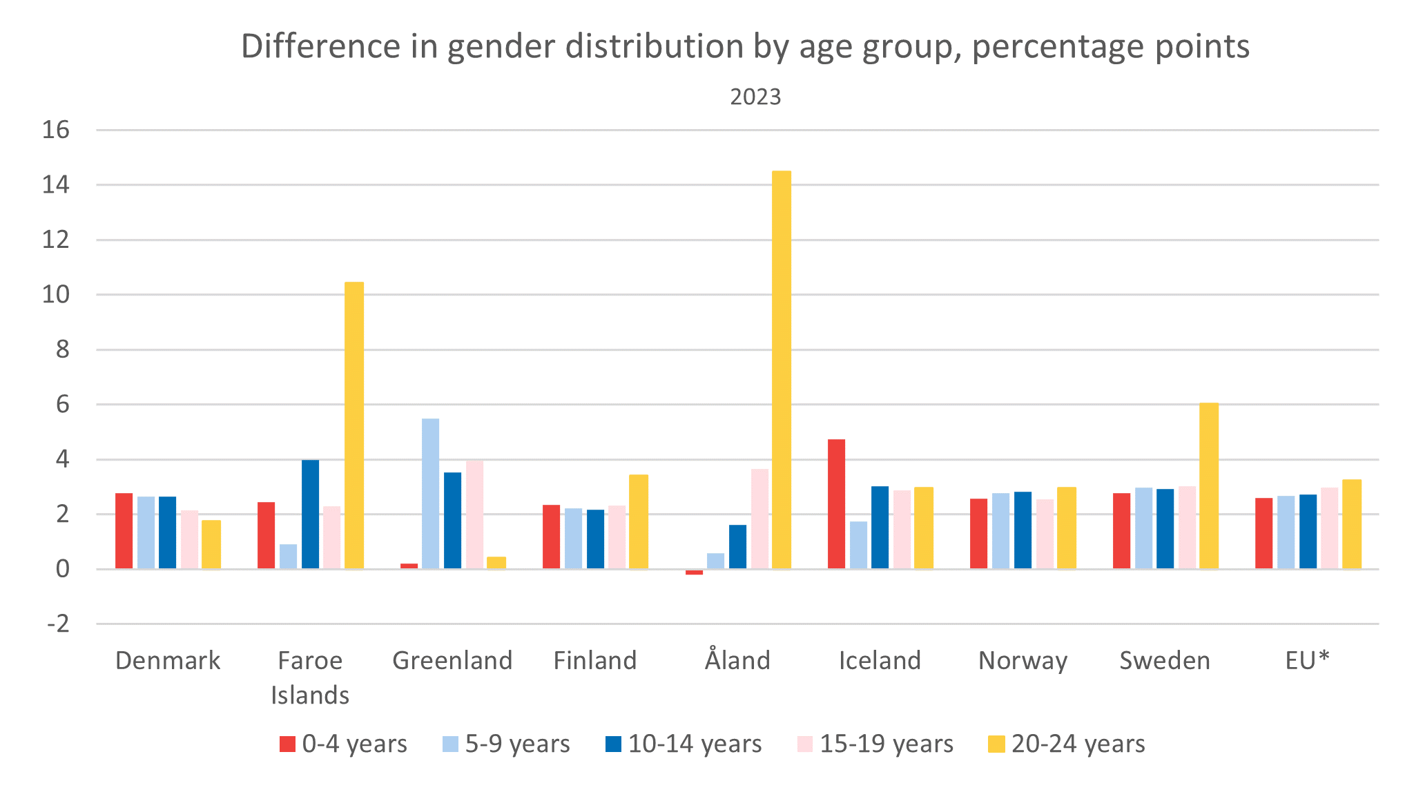 - For some countries the differences are higher with higher age. The largest differences can be seen for ages 20-24 years in the Faroe Islands and Åland, with the share of women being 10 and 14 percentage points fewer than men, respectively. These are two countries where access to higher education is limited and the labour market is smaller, which might be part of the explanation - young women could be moving to a greater extent than young men, for education and work.