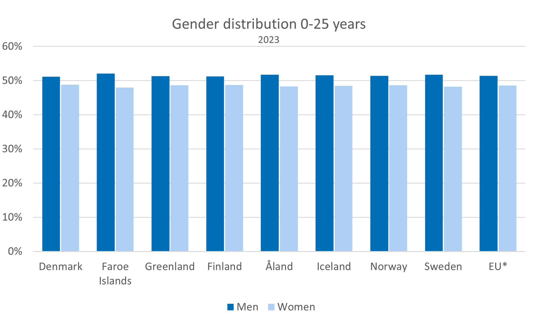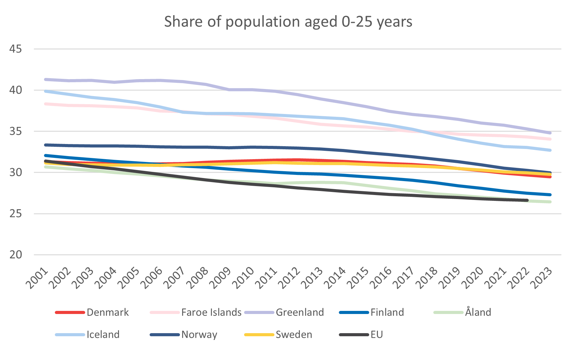 The proportion of children and young people in the population ranges from Greenland, with a share as high as 35% in 2023, through to Åland, with a proportion of 26%. The latter is just under the EU average of 27% (2022 value, 2023 values are not yet available for the EU).