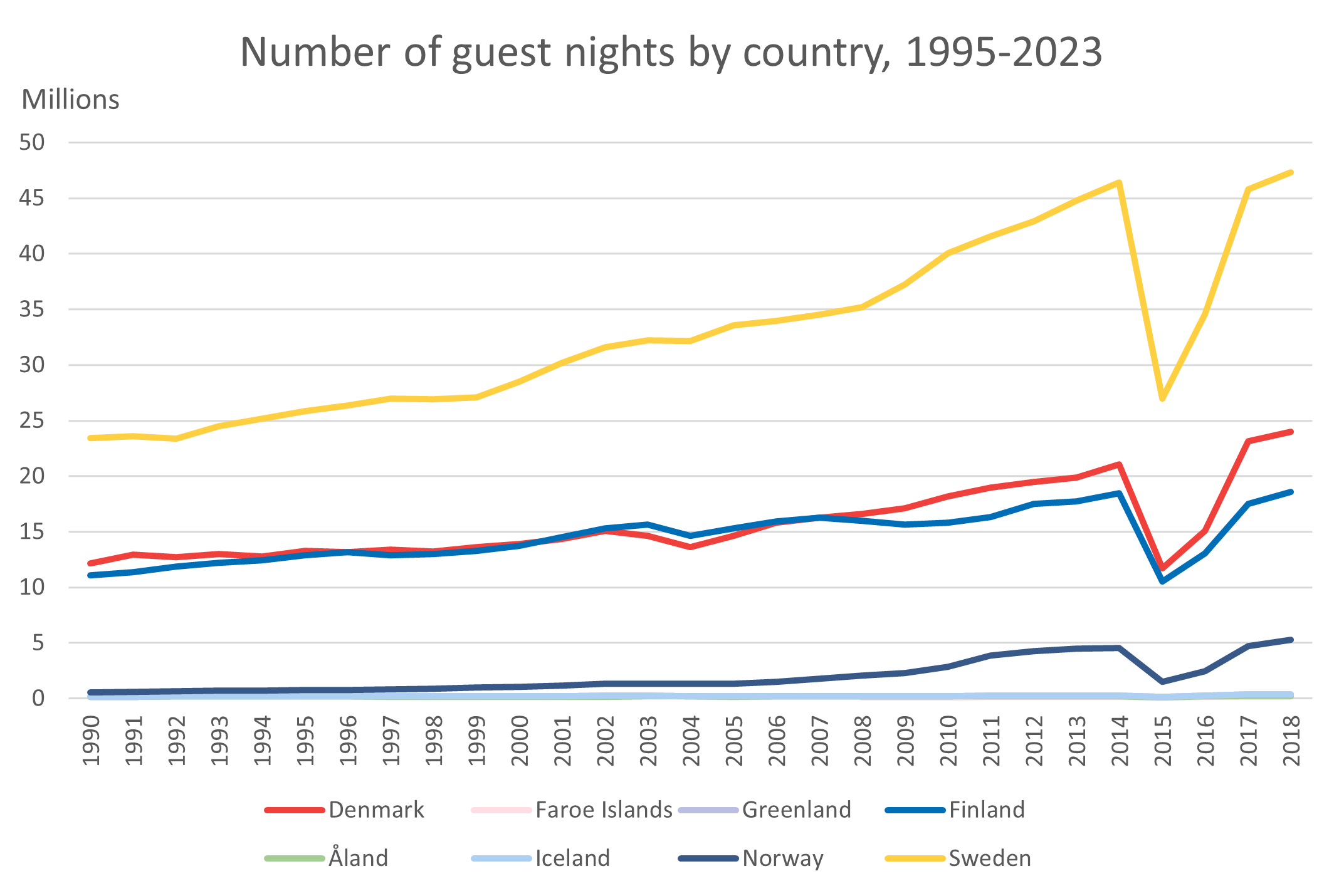 Sweden has been the country with the largest number of guest nights during the whole period, up to double the number of Norway in second place. In 2023, Sweden reported 47 million guest nights while Norway reported 25 million. Denmark and Finland had very similar numbers during the first part of the period, but in the last ten years the number of guest nights in Denmark has increased at a higher rate, and the number is now close to that of Norway, 24 million compared to just under 19 million for Finland. Iceland has had the largest percentage increase, the guest nights in 2023 were 5.3 million, ten times the number in 1995. Faroe Islands and Åland have similar number of guest nights per year today, around 230,000, while Greenland have about 360,000.