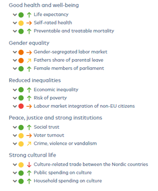 However, the Nordic countries still have room for improvement, especially in terms of gender equality, integration of non-EU citizens in the labour market and self-assessed well-being. Since the baseline report, the status picture of this strategic priority has not changed enough for the status of any indicator to change colour. The figure below shows the status and the and prognostic trends for the socially sustainable Nordic indicators.