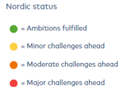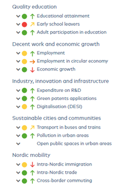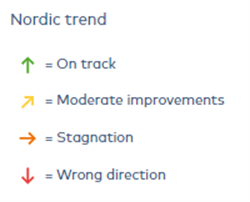 On the Nordic Statistics web page an overview of the Nordic indicators can be found (link given below). Next to the indicator name is a circle and an arrow. The colour of the circles shows the status of the indicator today. The direction and colour of the arrows on the other hand indicates the prognostic moving direction, the trend, indicating if the target is about to be met given the development up until this point.