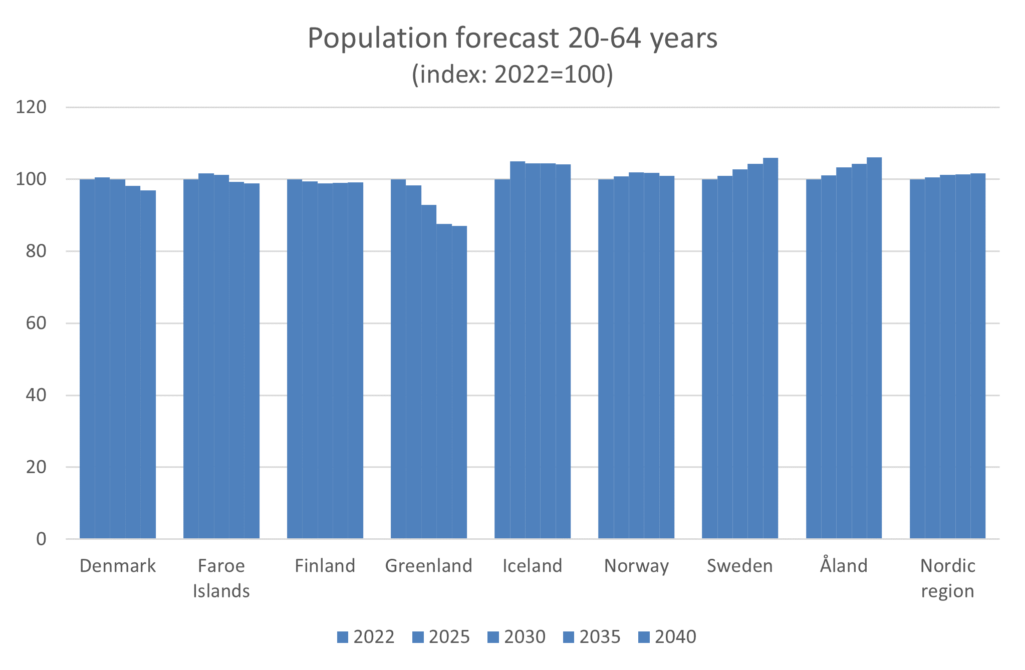 The group aged 20-64 years is expected to be stable, with only slight decreases or increases, with the exception of Greenland.