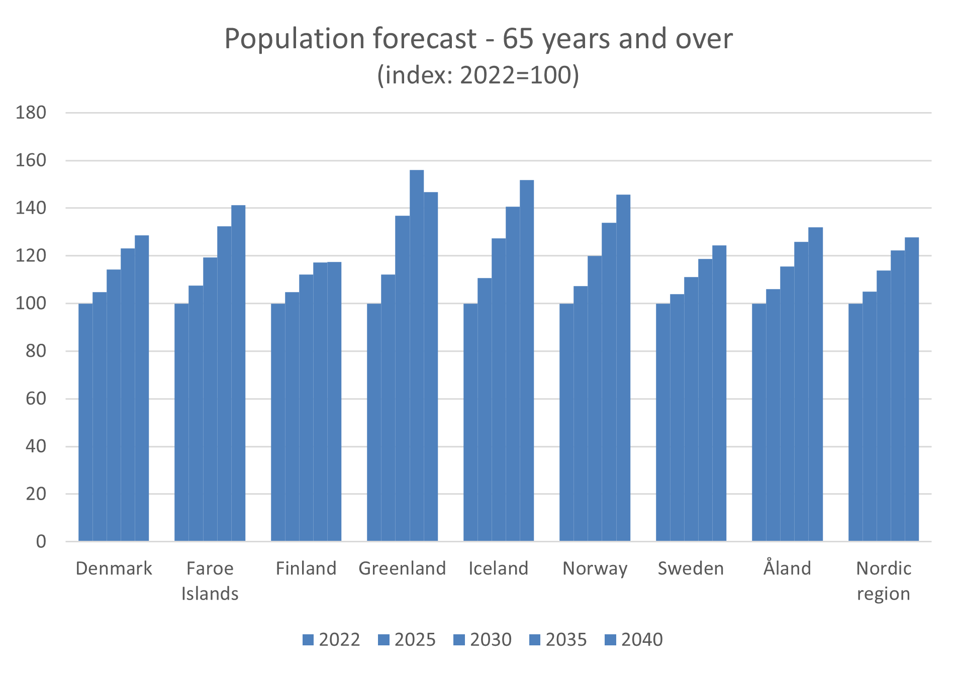 The group aged 65 years and older is expected to increase in all the Nordic countries and self-governing regions. The increase is forecasted to almost 30 percent on a Nordic level varying between 17 percent in Finland to 52 percent on Iceland.